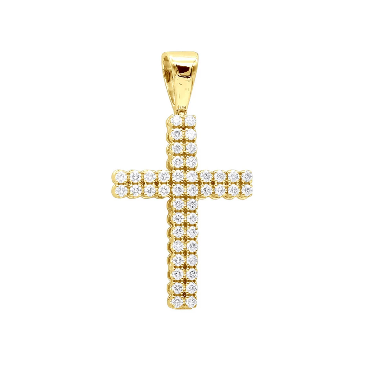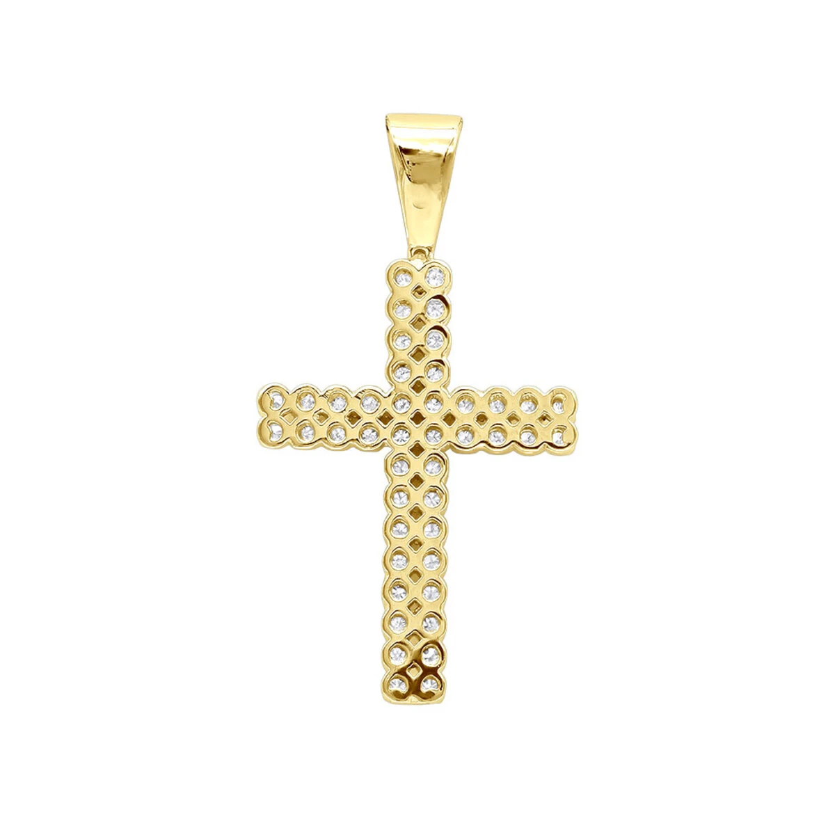 From our religiose jewelry collection; This 1.5 carat Diamond Cross Pendant for men and women in 10K Gold weighs approximately 8 grams and showcases 46 sparkling round diamonds. This striking cross pendant expertly crafted to meet the highest industry standards features a highly polished golden bail and a beautiful gallery back. Demonstrating numerous diamonds prong set in dazzling rows and being 1 3/4in. (44mm) & 15/16in. (24mm) wide it will be a perfect fit for both ladies and gentleman. Bold design and timeless silhouette, this diamond cross is available in 10K white, yellow or rose gold. You also can personalize this piece or check we’ve already made and create your own design.