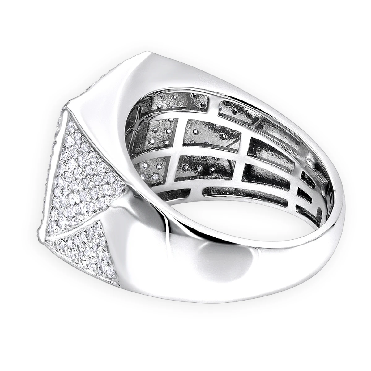 This 1.75ct Diamond Affordable Sterling Silver Pinky Ring for Men features an intricate geometrical design with an array of white round diamonds set on voluminous top part and sides of the band. A modern and graphic style, this ring is 5/8in (16mm) wide and will make a perfect pinky ring as well a very unique wedding band. This men’s diamond ring in sterling silver is a great alternative to gold jewelry, and will be a great gift idea for any occasion.