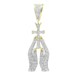 10K Yellow Gold Diamond Praying Hands And Cross Charm Pendant For Men 0.9