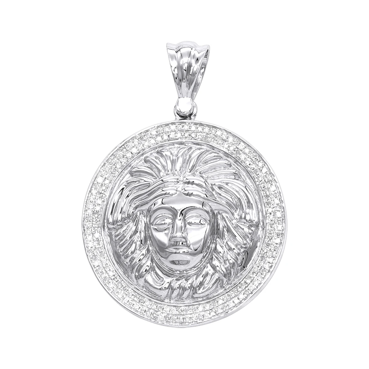 This beautiful and affordable 10K Gold Versace Style Diamond Pendant Medusa Head Medallion by Luxurman showcases 0.5 carats of sparkling round cut white diamonds. Featuring a Versace style design this gorgeous medusa head pendant is available in 10K white, yellow and rose gold. You also can personalize this piece or check we’ve already made and create your own design.