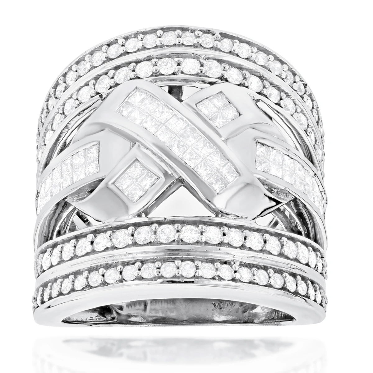 This Unique 14K Gold Criss Cross Diamond Ring showcases 2.20 ctw of invisibly-set princess cut diamonds and pave-set round diamonds. Featuring a luxurious criss cross design and a highly polished gold finish, this diamond ring is available in 14K white, yellow and rose gold.