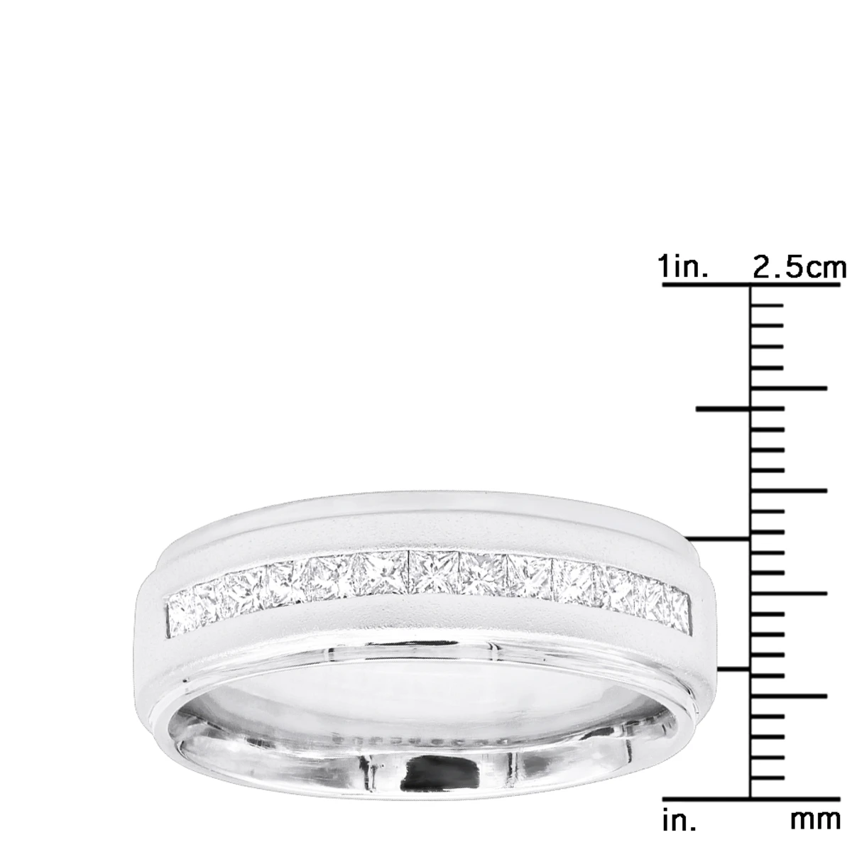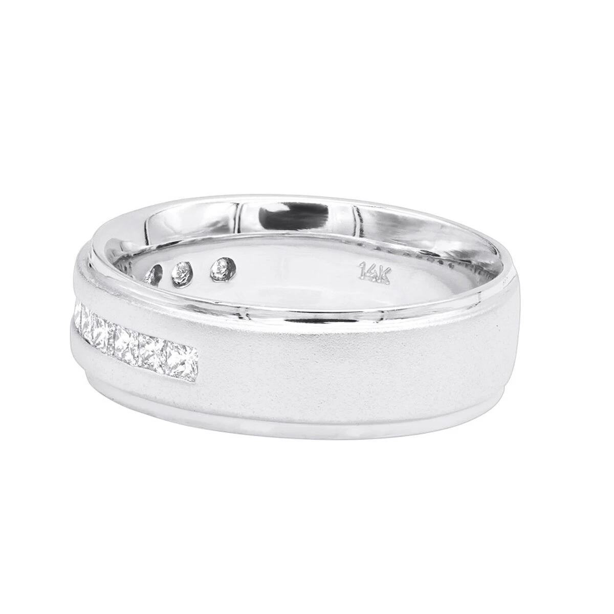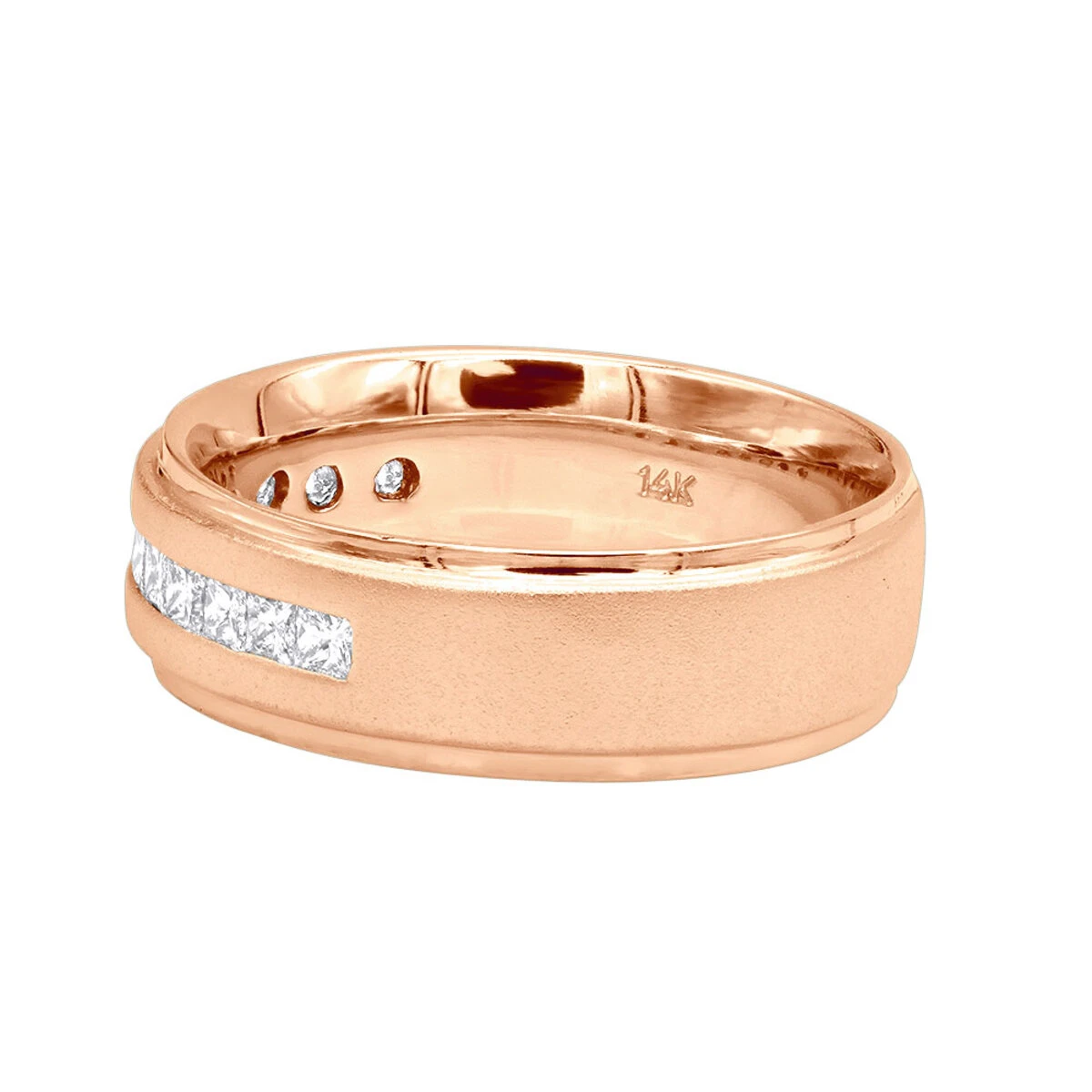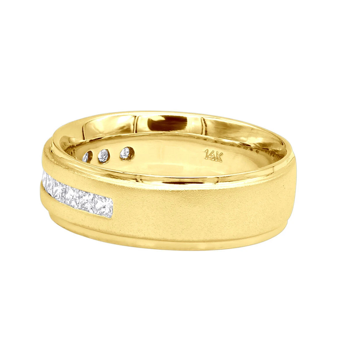This fantastic 14K gold diamond wedding rings collection piece is comfort fit and features 0.75 carats of sparkling princess cut diamonds, each channel set in a highly polished and brushed gold frame. This contemporary unisex diamond wedding ring is available in 14K white, yellow and rose gold.