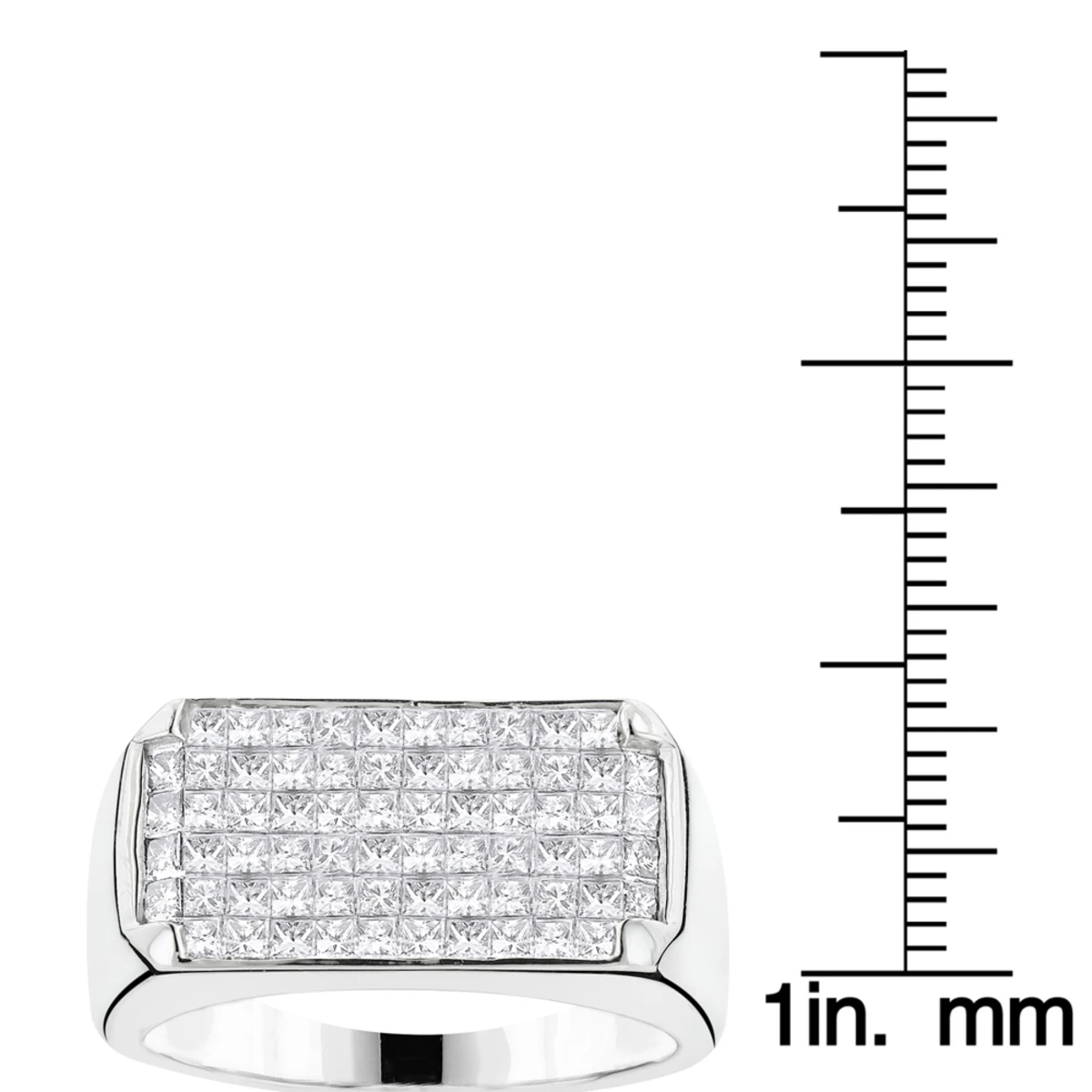 From our men’s diamond rings and wedding bands collections This impressive 14K Gold Men’s Princess Cut Invisible Diamond Ring weighs approximately 9 grams and showcases 2 carats of dazzling princess cut diamonds, each invisibly set in a lustrous gold frame. Featuring a simple yet luxurious design and a highly polished gold finish, this men’s diamond ring makes a very unique wedding band or a pinky ring and is available in your choice of 14K white, yellow or rose gold.