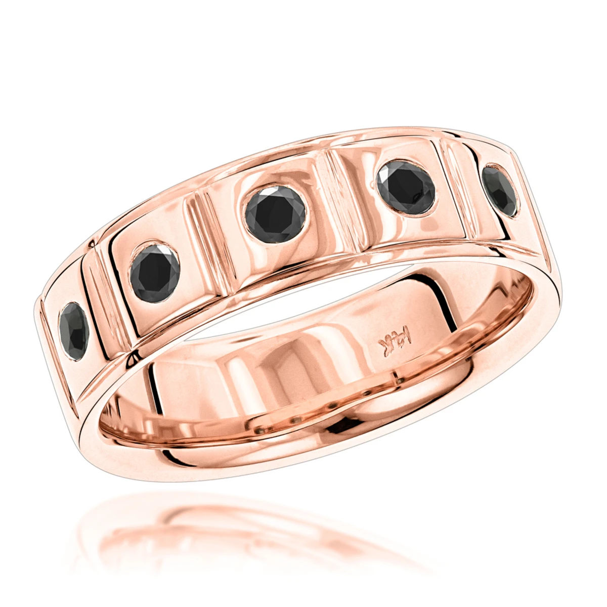 14K Yellow Gold Black Diamond Wedding Band For Men Comfort Fit Five Stone Ring