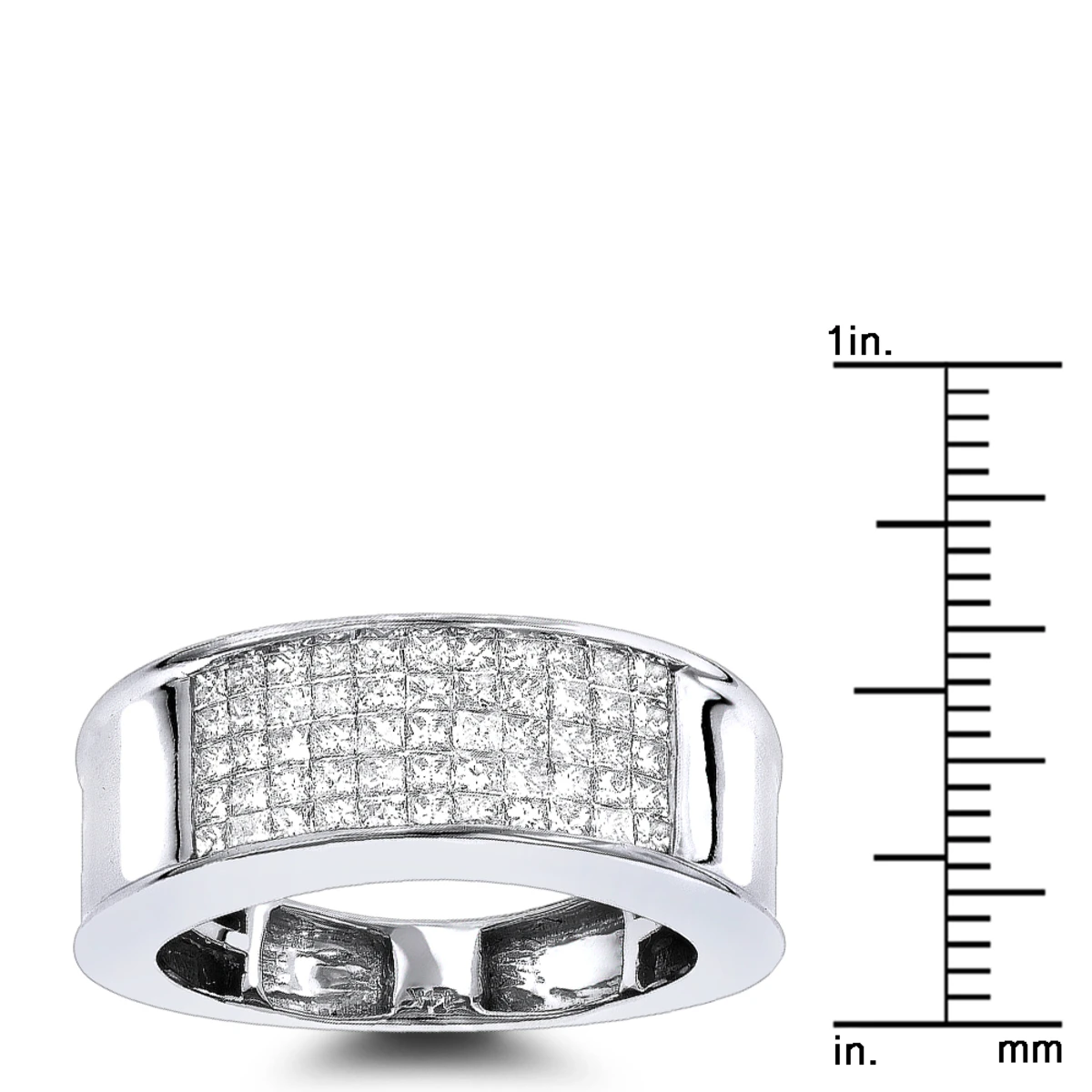 From our men’s diamond wedding rings collection This luxurious 14K Gold Men’s 1 carat Diamond Band with princess cut diamonds features 5 rows of invisibly-set princess cut diamonds, and weighs approximately 8 grams. Showcasing a magnificent look and a highly polished gold finish, this men’s diamond ring is 3/8 inches (9mm) wide and is available in 14K white, yellow and rose gold.