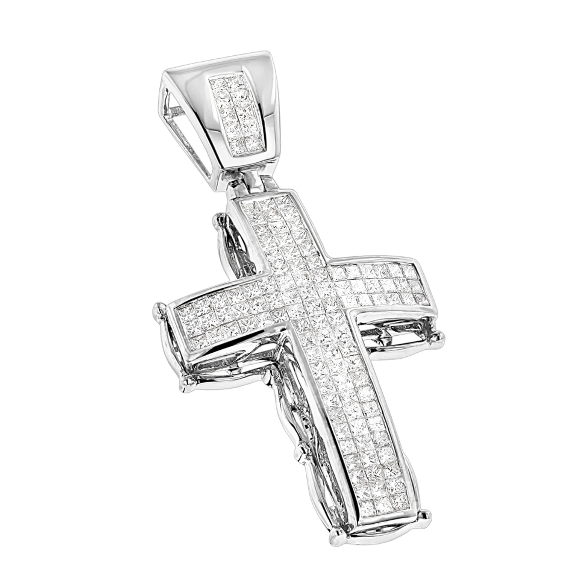 This inspiring 14K Gold Men’s Cross Pendant with Princess Diamonds weighs approximately 9 grams and showcases 2.25 ctw of exquisite princess cut diamonds, each invisibly set in a highly polished gold frame. Featuring an iced out bail and a fine gallery back, this men’s diamond cross pendant in available in 14K white, yellow and rose gold. You also can personalize this piece or check we’ve already made and create your own design.