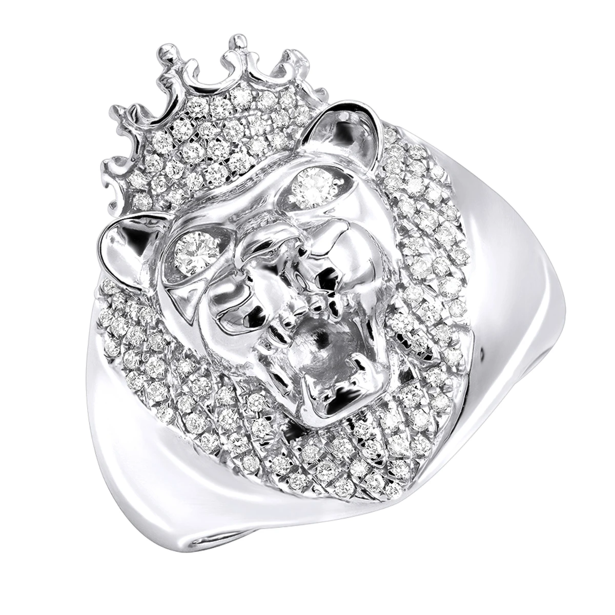 14K Yellow Gold Men’s King Lion Head Ring With Diamonds And Crown Pinky Ring 0.55ct