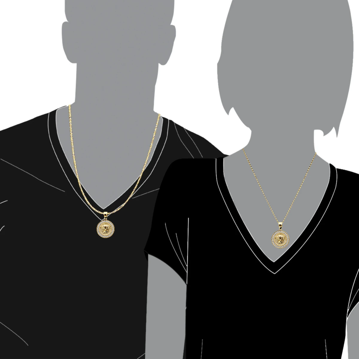 This attractive 14K Gold Vintage Versace Style Diamond Pendant Medusa Medallion is sure to bring stunning individuality to any necklace or chain. Handcrafted to perfection and decorated with 2 carats of sparkling pave set round cut diamonds surrounding the centered Medusa face medallion giving this Versace style diamond pendant an unparalleled prominence. This luxurious medusa head diamond pendant is available in 14K white, yellow and red gold. You also can personalize this piece or check we’ve already made and create your own design.