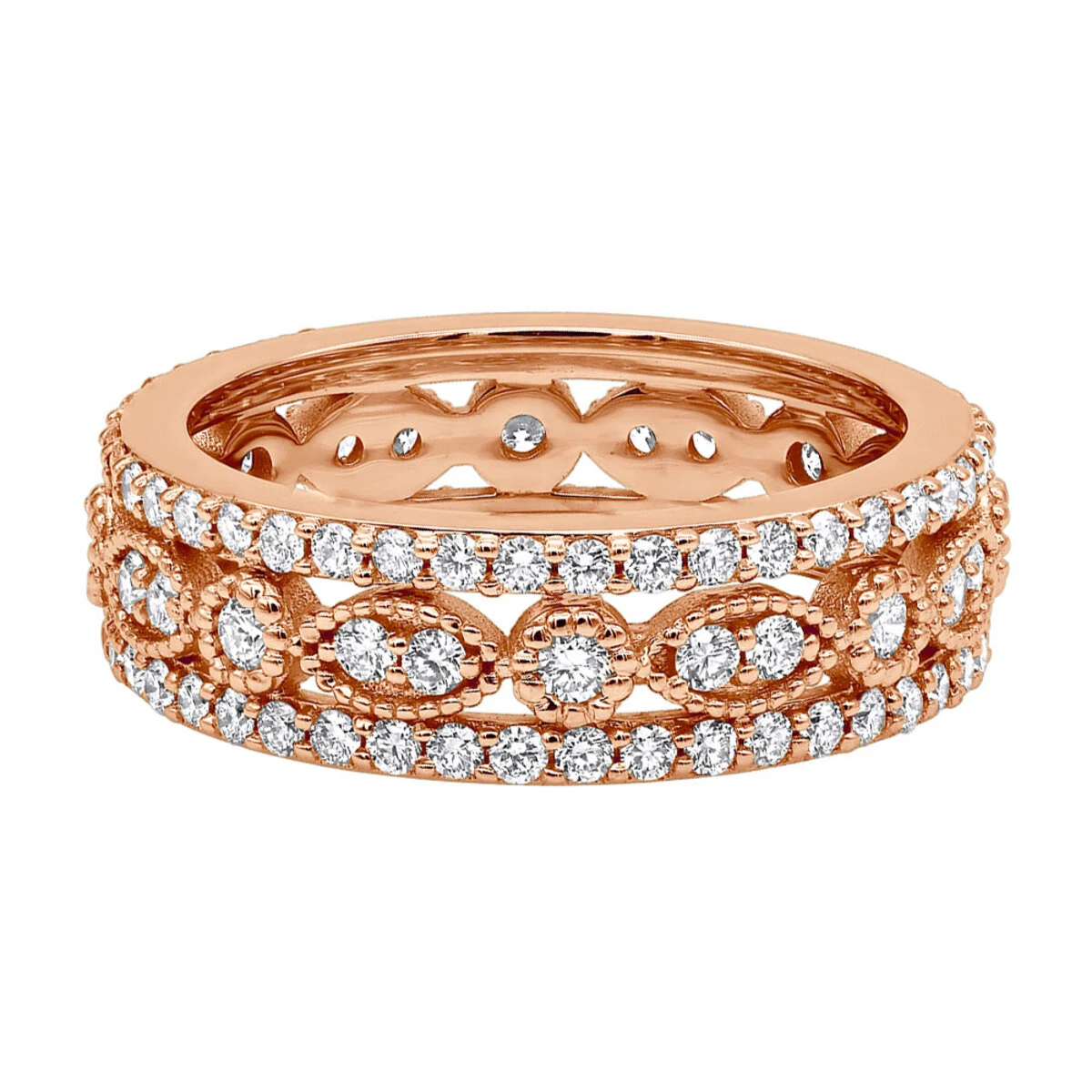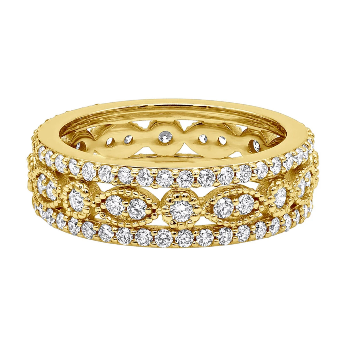 This luxurious 18K gold Tacori Style diamond full eternity ring features 1.81 carats of clear round cut diamonds and is available in lustrous 18K white, yellow and rose gold. Also available in a platinum diamond eternity ring design(please contact us for pricing details).