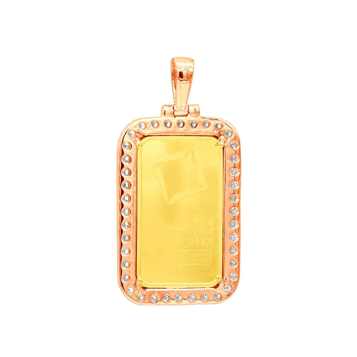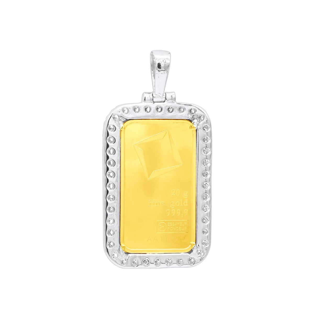 From our men’s diamond pendants collection This fantastic Custom 24K Gold Suisse Bar Diamond Dog Tag Pendant showcases a 20 gram Suisse Bar in a 14k gold frame paved with over 2 carats of sparkling round diamonds along the border of the pendant and on the bail perfectly decorating the precious 20 gram bar of 24K gold. The front of the bar can be engraved with any initial, name or text of your choice. Create a unique customized jewelry piece for yourself or your loved one with the frame made of 14K white, yellow or rose gold. The pendant is 2in. (50mm) long and 1in. (25mm) wide. You also can personalize this piece or check we’ve already made and create your own design.