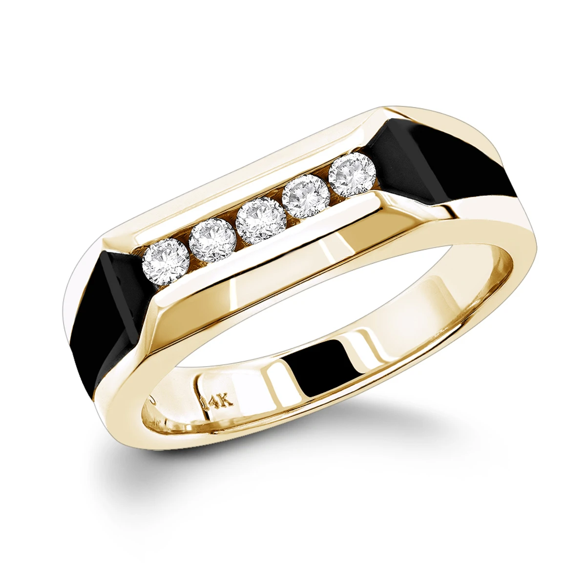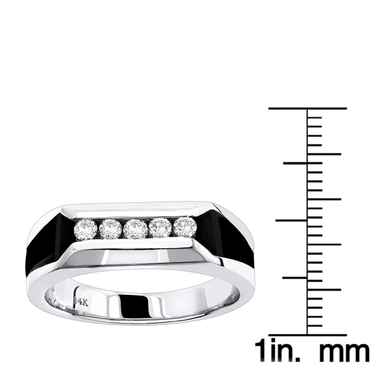This 5 Stone Round Diamond Men’s Wedding Ring with Onyx features 0.25 carats of round diamonds (5 diamonds) set in channel setting with onyx on the sides. This men’s diamond wedding ring makes a perfect five year anniversary gift and is available in 14k yellow gold, rose gold, white gold as well as 18k gold and Platinum as a custom order. Please note: it will take us 3-5 business days to make this men’s diamond ring for you so please plan accordingly.
