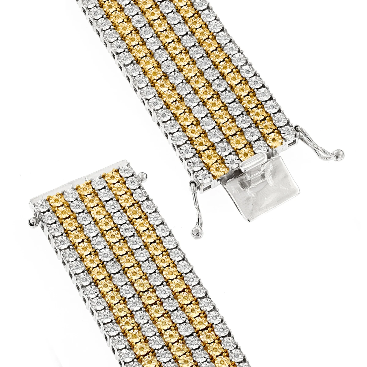 This 7 Row White and Yellow Diamond Bracelet for Men in Sterling Silver weighs approximately 100 grams and showcases 1.5 carats of genuine white and yellow diamonds. Featuring a trendy cuff design and a luxurious rhodium plating for extra shine, this men’s silver diamond bracelet is an affordable alternative to gold jewelry.
