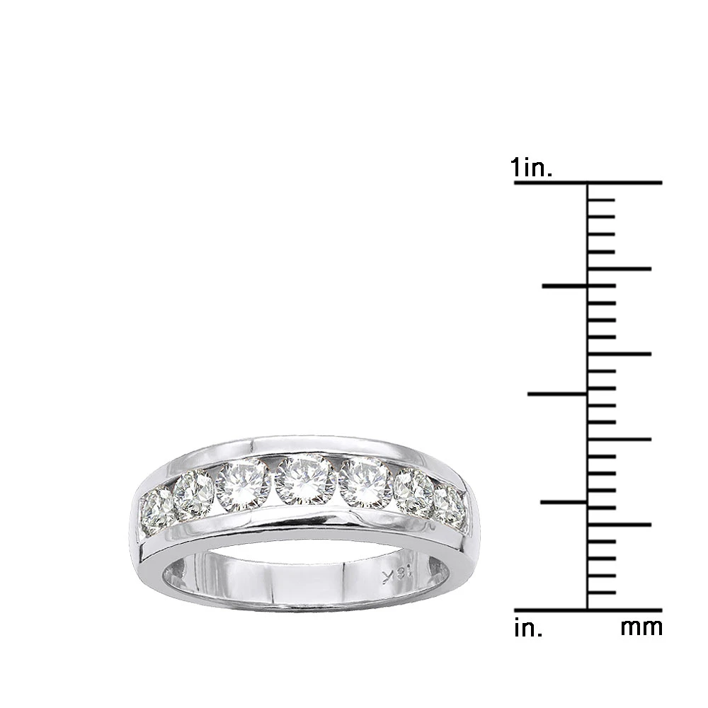 From our diamond wedding bands for women and men collection This 18K Gold Band 7 Stone Round Diamond Wedding Ring features 7 sparkling diamonds totaling 1.5 carats – each with a great color rank of G-H and clarity of VS-SI – beautifully channel-set in a sleek design. Diamonds will always have a majestic ambience. Combined with a highly polished 1/4in (7mm) wide 18K gold band and expert craftsmanship, we created a bold and dashing diamond band that will work wonders for weddings and will be perfect as an anniversary ring. The band is available in 18K white, yellow or rose gold, various sizes and can also be custom made in 14K gold or platinum.