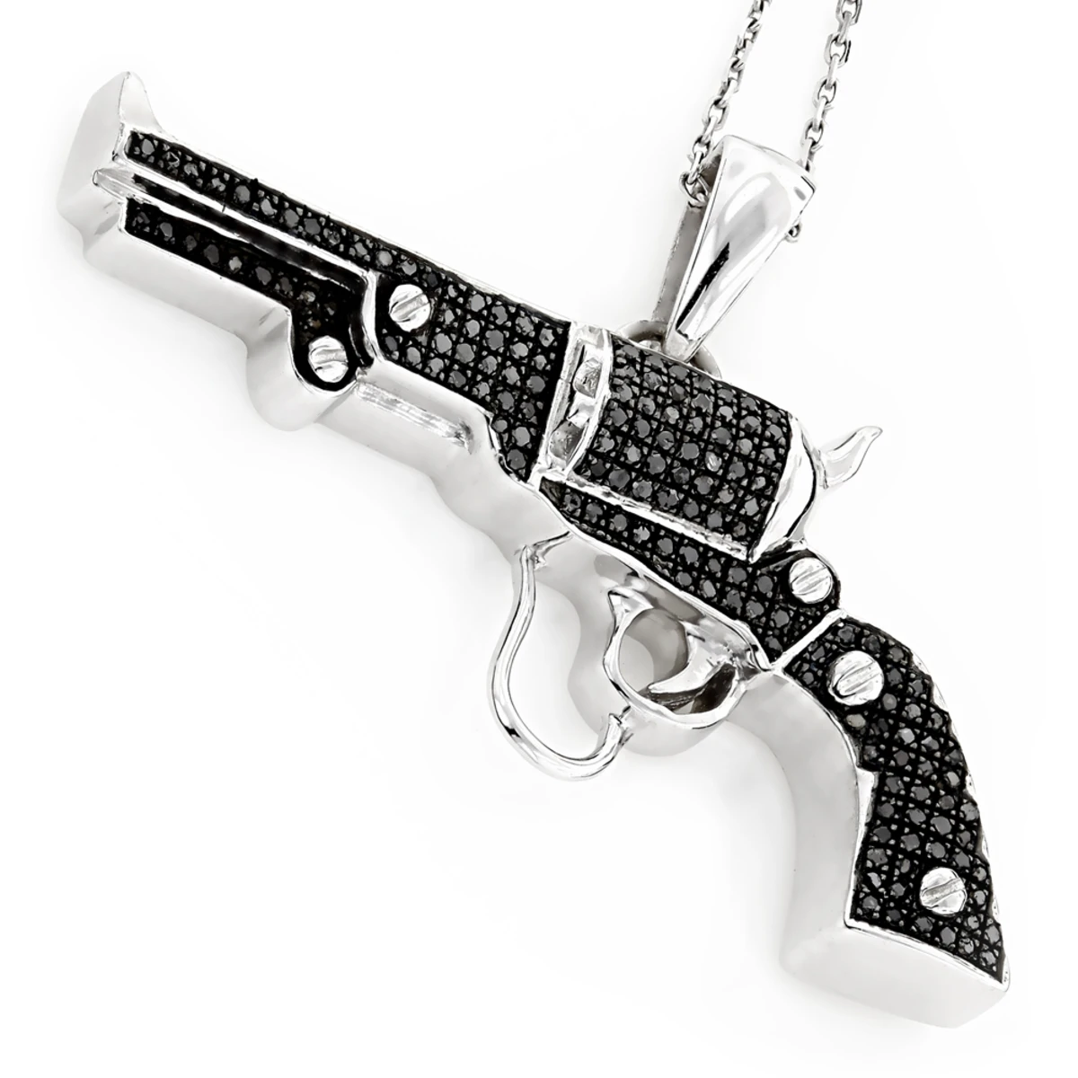 Unique Black Diamond Jewelry: This Sterling Silver Gun Pendant showcases 0.90 ctw of fancy black diamonds. This silver diamond revolver pendant features a 3-D design and a luxurious rhodium plating for extra shine. You also can personalize this piece or check we’ve already made and create your own design.