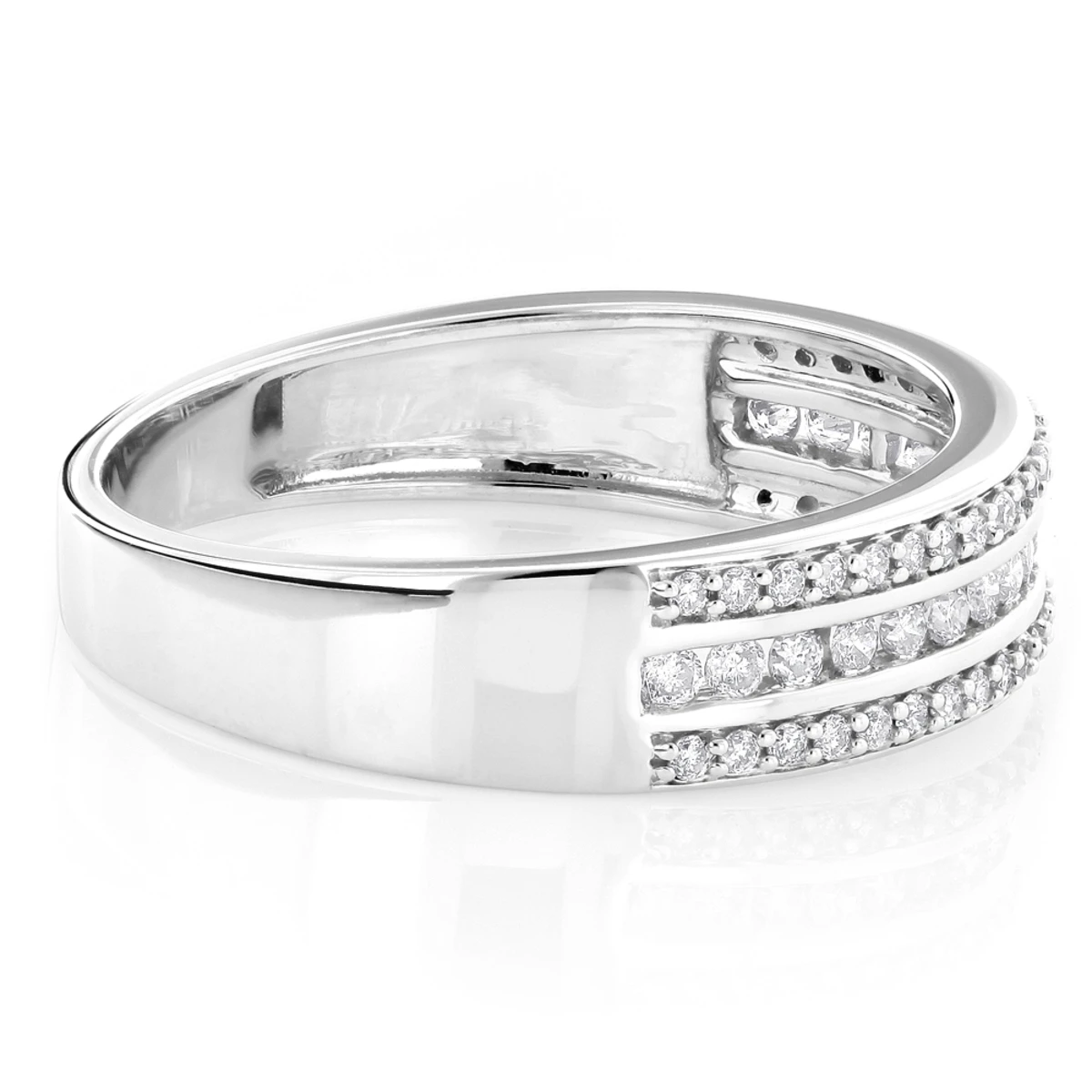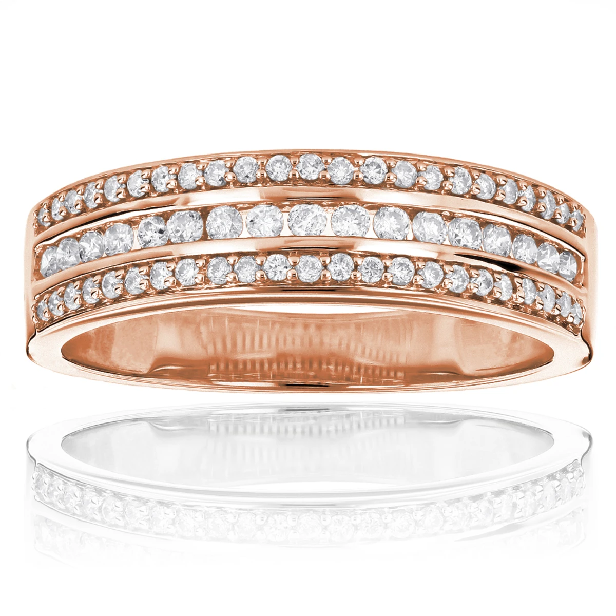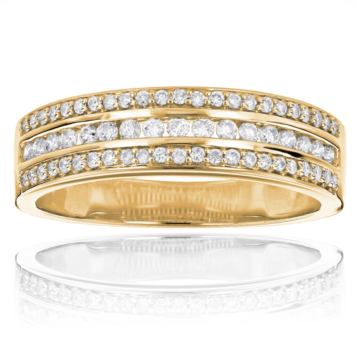Elegant Diamond Wedding Bands! This 14K Gold Designer Diamond Ring from our bridal jewelry collection showcases 0.5 carats of sparkling round diamonds, each masterfully set in lustrous 14K gold. Featuring a 3 row design and a highly polished gold finish, this unisex diamond wedding band is available in 14K white, yellow and rose gold.