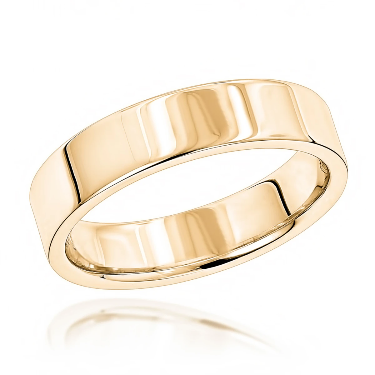 From our classic wedding bands collection for mena and women this 5mm wide comfort fit wedding ring features a timeless and graphic design with a highly polished flat top and comfort fit finish. Expertly crafted to meet the highest industry standards this flat 5mm wide band is architecturally exquisite and will be in style forever! This wedding band is available in 14K white, yellow and rose gold as well as can be custom made in 18k gold and Platinum as a custom order. The band comes in a beautiful jewelry box.