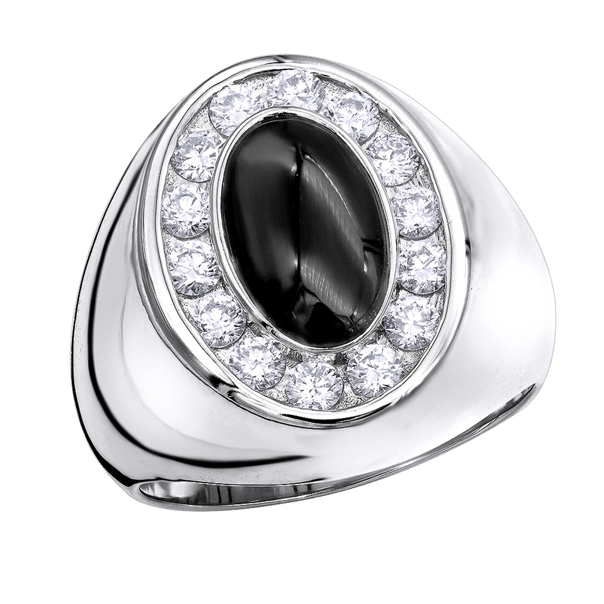 From our men’s diamond rings collection: Rings with black onyx always look mysterious and unique. This mesmerizing 1 Carat 14 Karat Gold Onyx Diamond Ring For Men by LUXURUMAN is featuring an intricate elongated highly polished golden band, an oval black onyx in the middle and contrasting white round diamonds set around it. A powerful protection stone, Black Onyx is said to absorb and transform negative energy and help to prevent the drain of personal energy. Featuring a one of a kind design, this men’s black onyx diamond ring is available in 14K white, yellow and rose gold and will look amazing in every colour. The ring is solidly made with solid back and is quite large at 9/16 inches(13mm) long, 3/4 inches (19mm) wide and weighs approximately 26 grams. This style also makes it a perfect pinky ring and a wonderful present for any occasion!