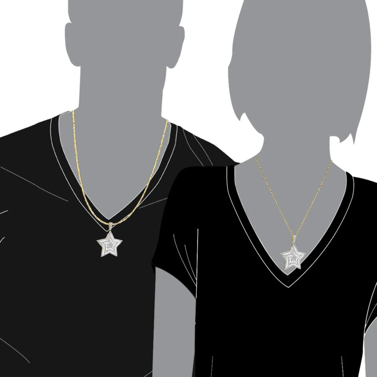 From our diamond pendants for men collection: this large 2 inch men’s diamond star pendant in 14k gold (available in white gold, yellow gold or rose gold) features unique combination of round and baguette diamonds total 5 carats of diamonds, and represents individual strength and dazzling energy. Featuring impressive size and carat weight, it presents an array of multi shape white diamonds – sparkling round and scintillating baguettes – masterfully set on the whole surface of the star and it’s bail. This diamond star pendant is 1 9/16in (40mm) wide, 2in (50mm) long (with bail) and weighs approximately 11 grams. For a great gift for a loved one or even yourself, choose this stunning pendant crafted from the finest 14k white, rose or yellow gold. You also can personalize this piece or check we’ve already made and create your own design.