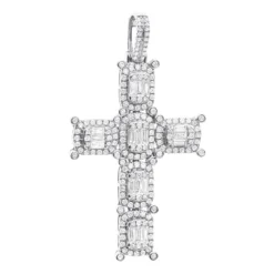 Large Diamond Cross Pendant For Men 14K White Gold Baguette Round Diamonds 3 Carat