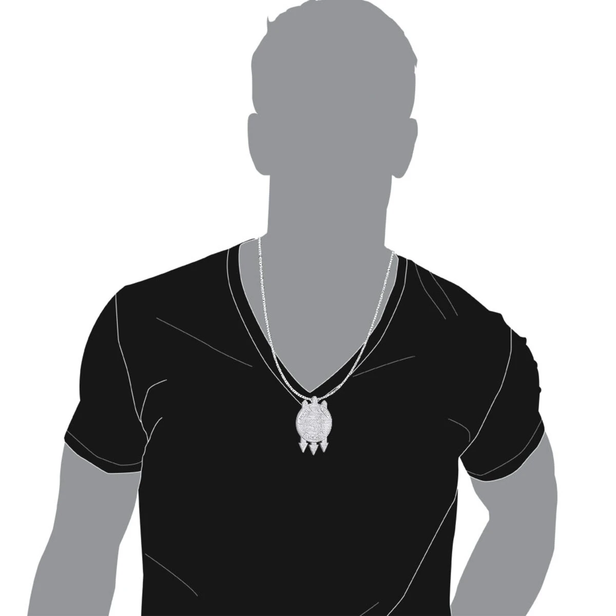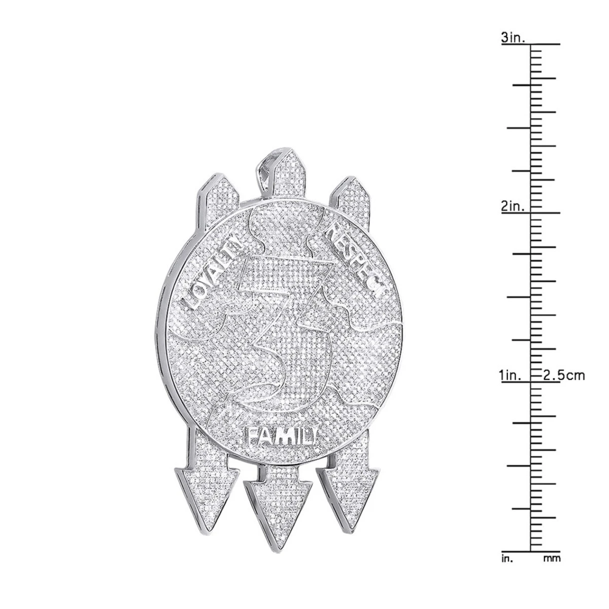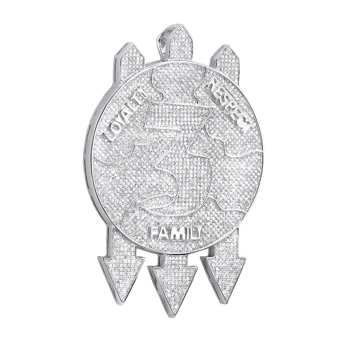 From our men’s diamond pendants collection this large Loyalty Respect Family diamond pendant was custom made in sterling silver and weighs approximately 65 grams and showcases 10 carats of sparkling round diamonds. Featuring an intricate, fully-iced out design and a luxurious rhodium plating for extra shine, this unique diamond pendant can be made in sterling silver, 10K or 14K white, yellow, rose gold or platinum and can be custom made with different color diamonds; contact us for details. Please note: this listing is for the pendant in 925 sterling silver. Chain must be purchased separately. You also can personalize this piece or check we’ve already made and create your own design.