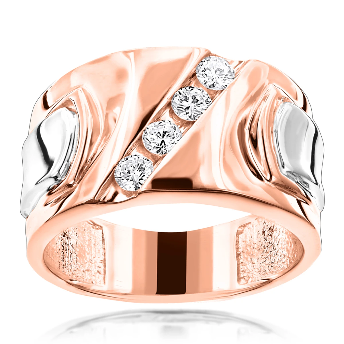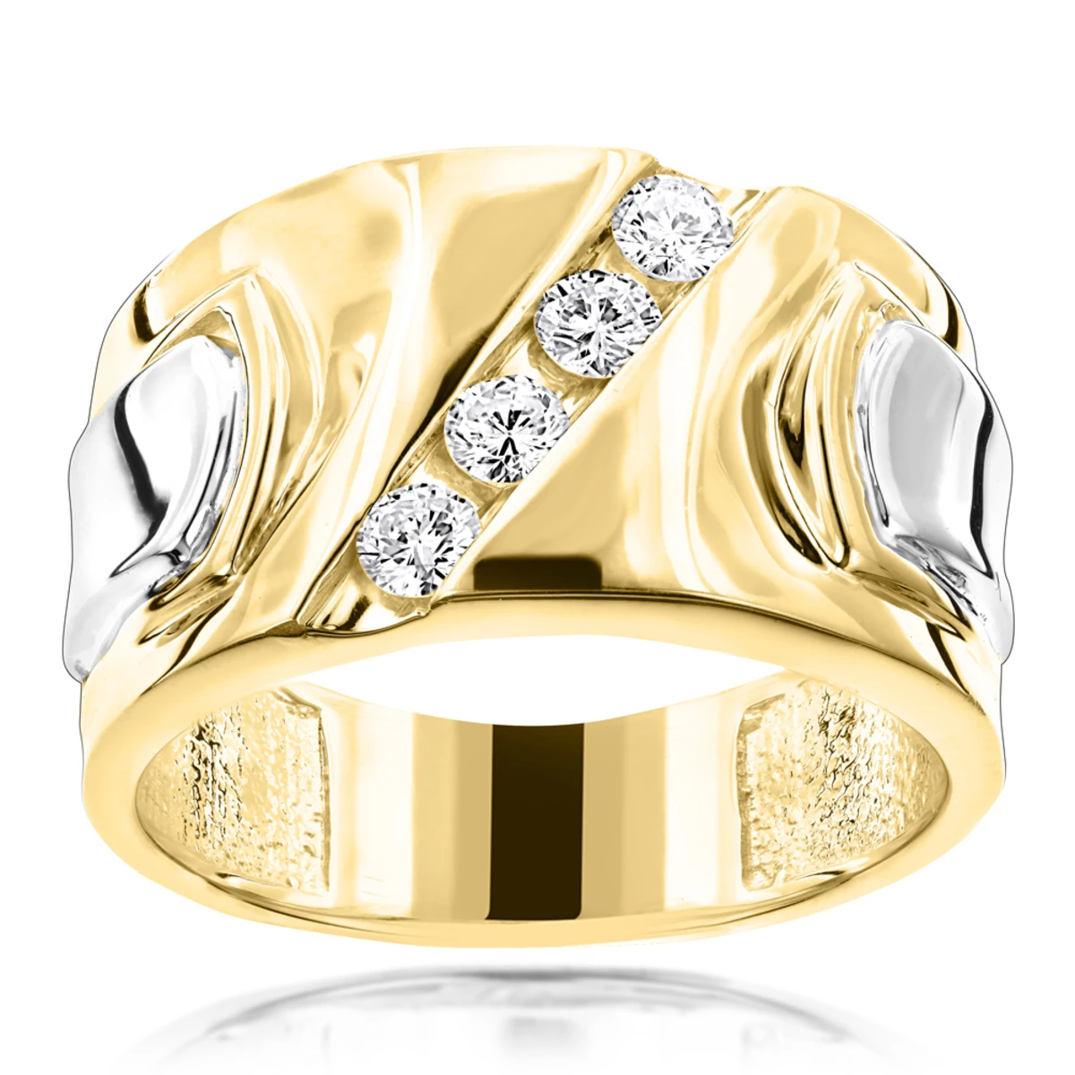 This one of a kind Luccello Brand 18K Gold Men’s Designer Diamond Ring showcases 4 dazzling high quality G/VS round diamonds totalling 1/2 carat, each diagonally channel-set in a lustrous gold frame. Featuring a simple yet luxurious design and a highly polished 2-tone gold finish, this magnificent men’s diamond ring makes a perfect 4-year anniversary present or a unique wedding ring, and is available in 18 Karat white, yellow and rose gold.