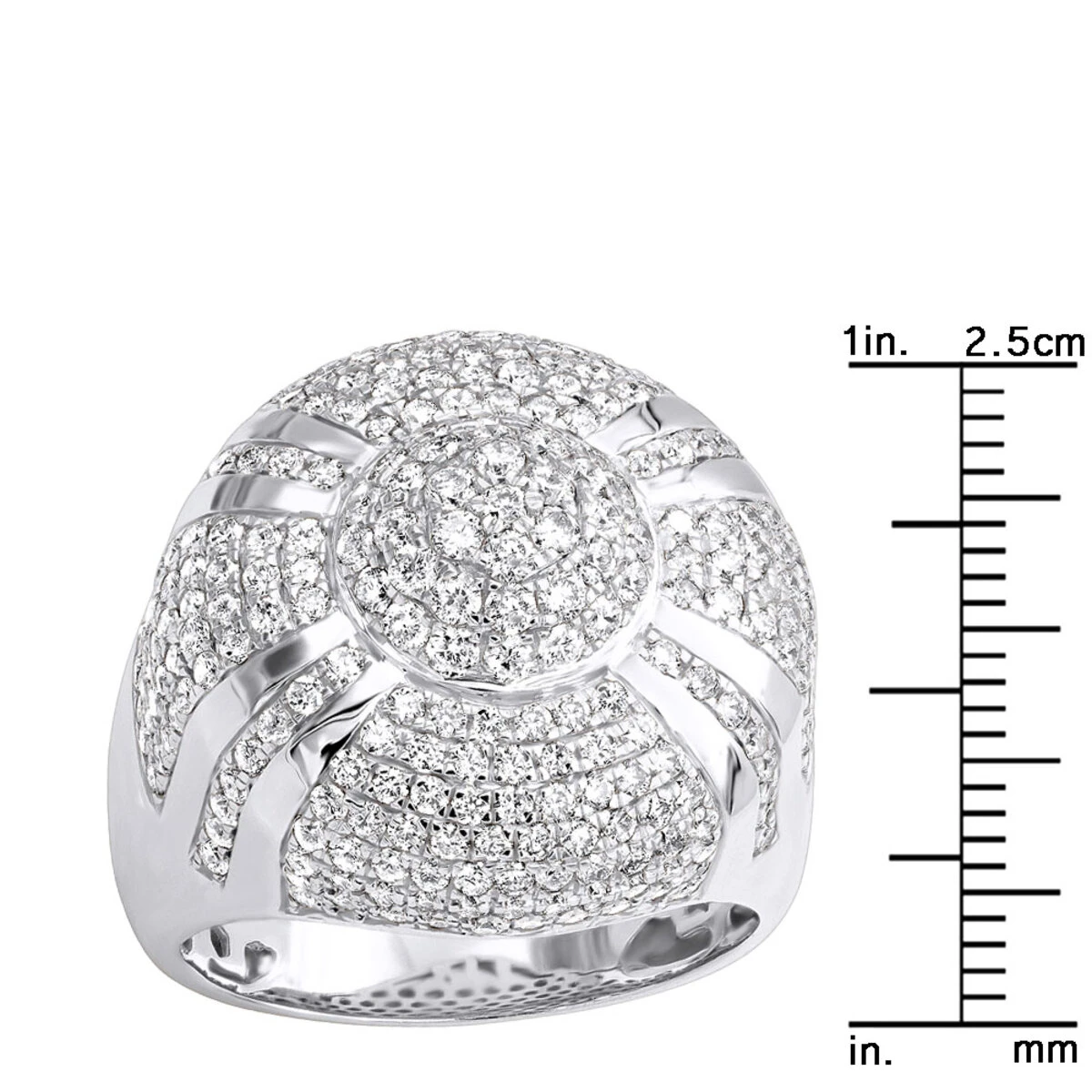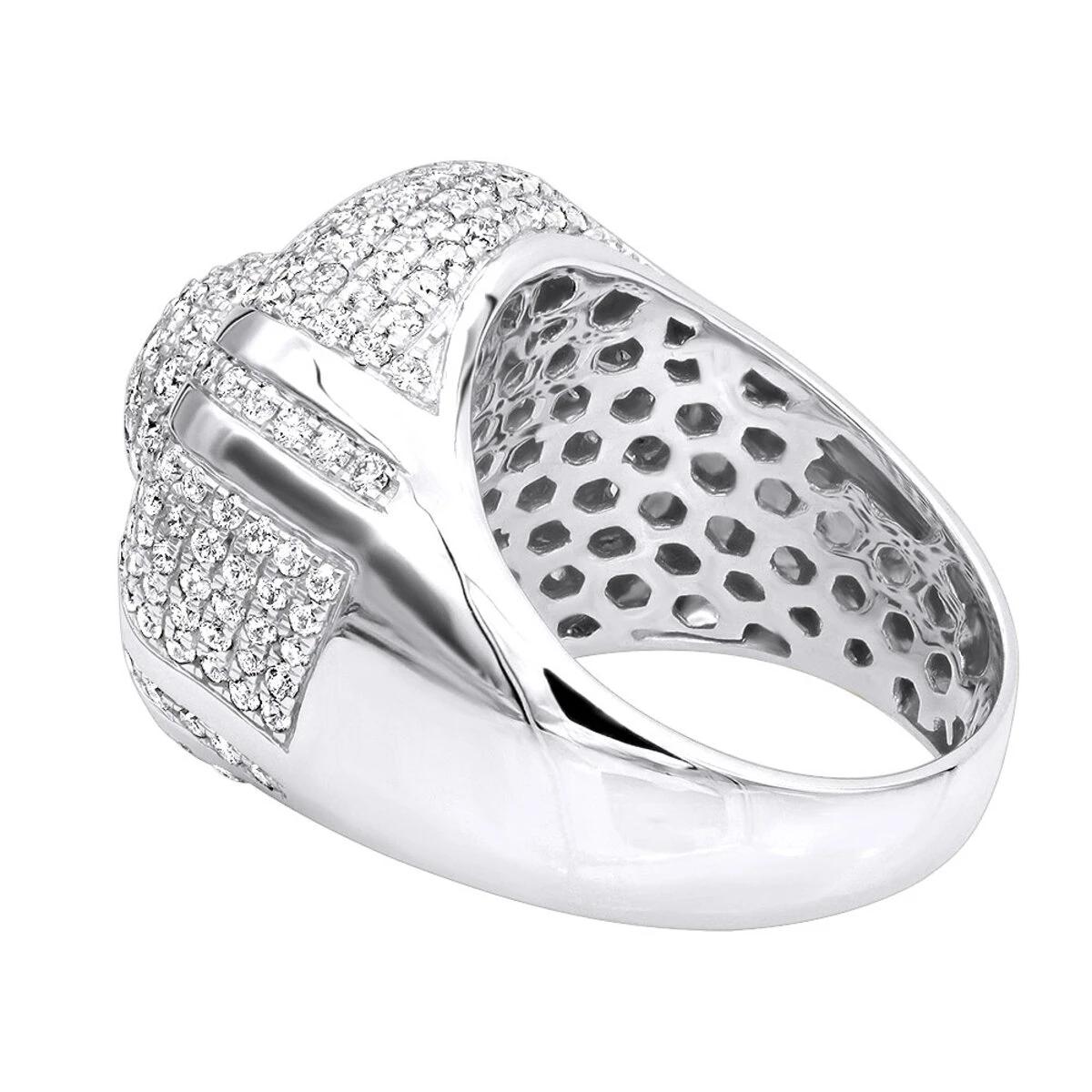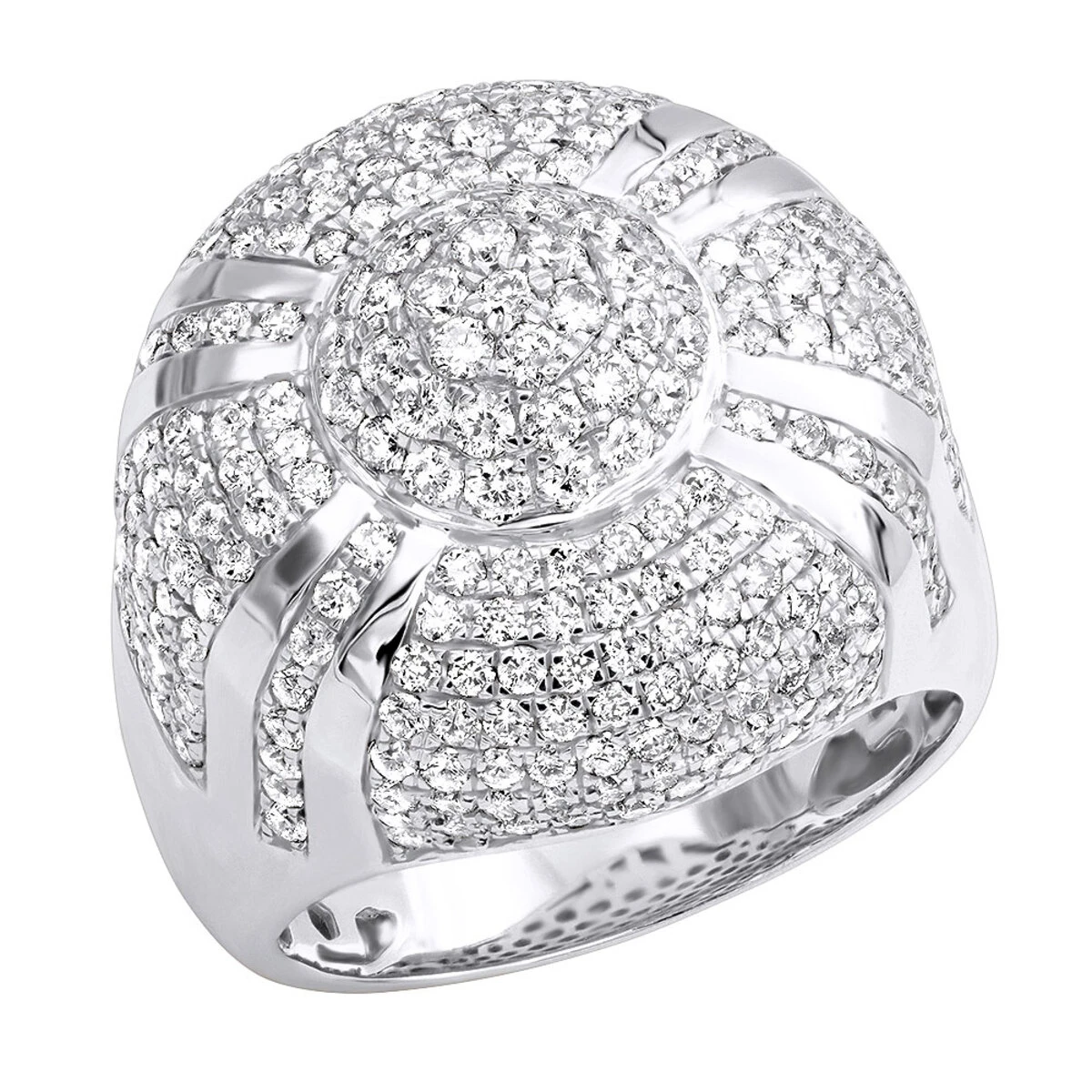 Men’s Statement Jewelry: this diamond ring for men by Luxurman features a grand design which can be worn as both a regular men’s ring as well as a pinky ring; this men’s diamond ring is quite large at nearly an inch in width: 7/8in (23mm) making it a great statement piece and is decorated with 4 carats of natural round diamonds. Very unique looking ring, buy yours today!