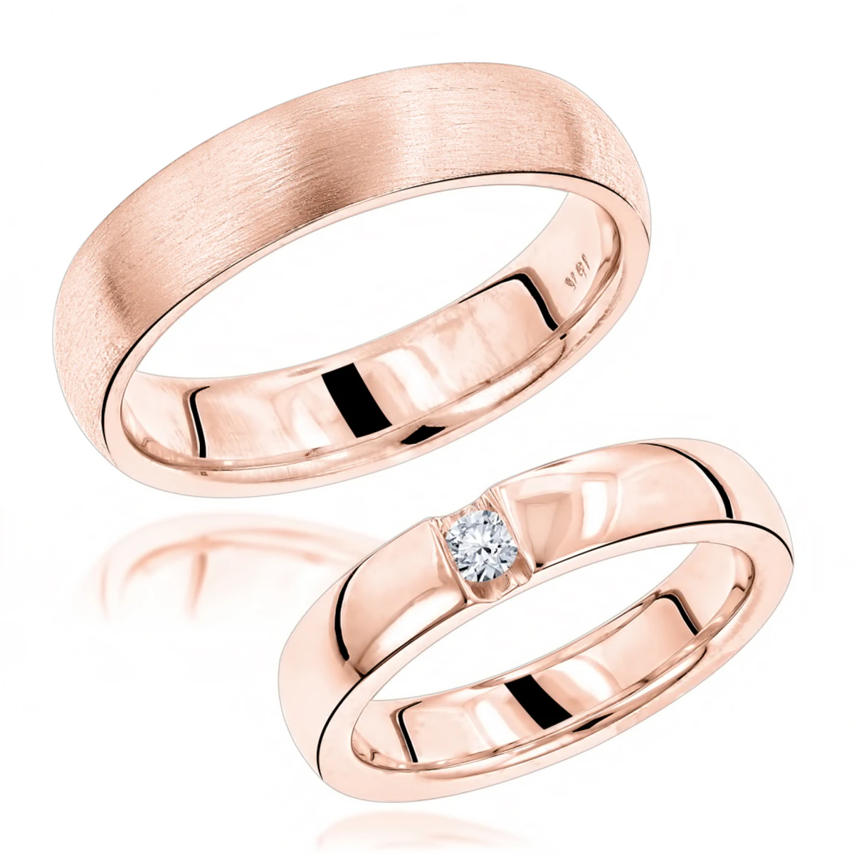 This amazing 18K Gold Diamond Matching His and Hers Wedding Band Set by Luxurman Comfort Fit Rings showcase a simple but classy design. Ladies wedding band showcases 0.1 carat round cut sparkling diamond masterfully set in highly polished 18K gold, men’s wedding band features a matte gold finish and a masculine design. Please note that gram weight of the rings depends on ring sizes. These beautiful matching diamond wedding bands are available in 18K white, yellow and rose gold, also available in Platinum as a custom order.