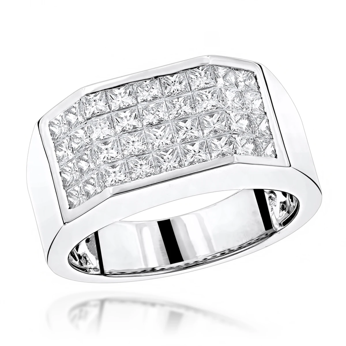 This absolutely gorgeous Platinum Princess Cut Diamond Band for Men by Luxurman with top quality F-G color VS clarity invisible set princess cut diamonds makes a classy looking yet unique diamond wedding band and also a great diamond Pinky Ring. This men’s platinum ring weights approximately 20 grams and showcases 3.25 carats of dazzling top quality G/VS princess cut diamonds. Featuring a simple 4 row design and large high quality diamonds invisibly set in luxurious platinum frame, this magnificent men’s diamond ring from our platinum and diamond jewelry collection is simply irresistible!