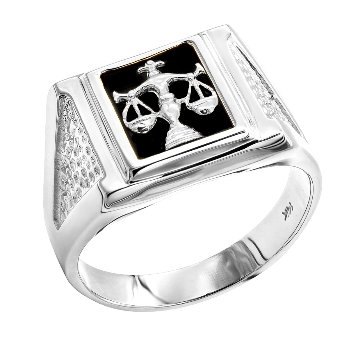 Fantastic Men’s Black Onyx Rings! This 14K White Gold Libra Scales Ring weighs approximately 9 grams and showcases a beautiful black onyx in the center, expertly set in a lustrous 14 Karat gold frame. Featuring a highly polished and textured gold finish, this men’s black onyx ring is available in your choice of 14K white, yellow and rose gold, and makes a perfect gift for any occasion.