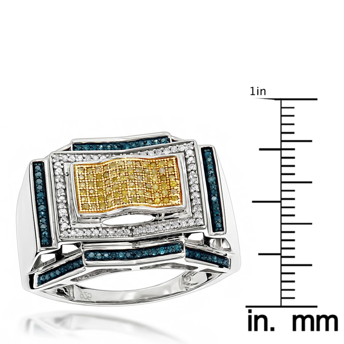 This stunning Men’s Color Diamond Ring is crafted from sterling silver and features a total of 0.5 carats of sparkling diamonds. The diamonds come in a mix of white, blue, and yellow colors, and are SI-I in clarity. The setting type is a pave setting, and the width of the ring is 5/8 inches (16mm). This piece of jewelry comes with a 1 year warranty. This handsome diamond ring is the perfect way to show your love and commitment to the special man in your life.
