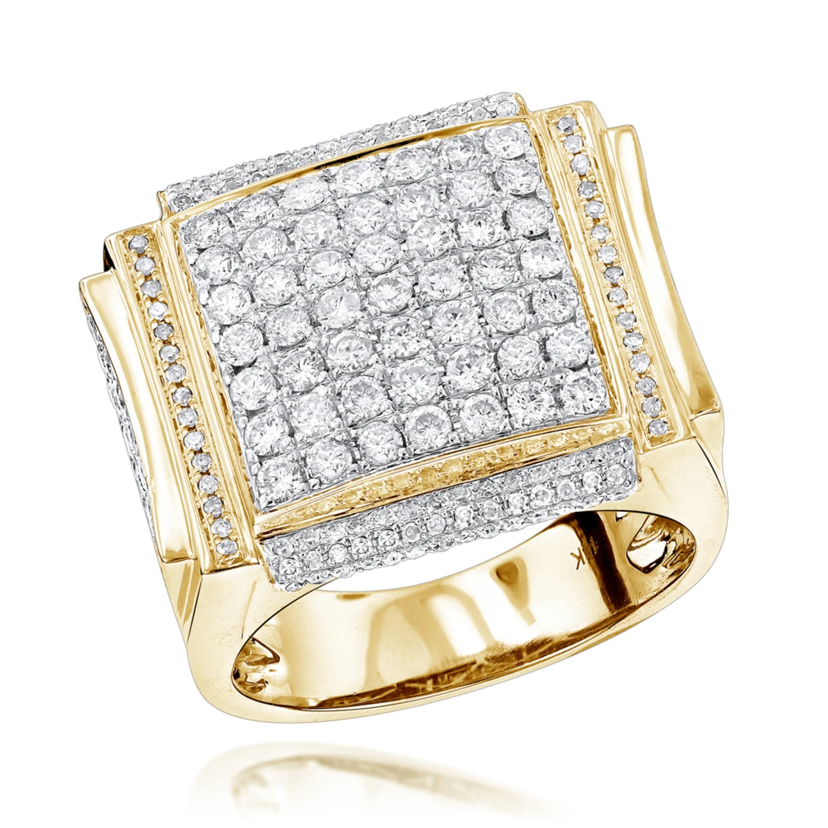 This Men’s Pave Diamond Ring in 14K from our Designer Jewelry collection weighs approximately 18 grams and showcases 3 carats of dazzling round diamonds. Featuring a luxurious iced out design and a highly polished gold finish, this men’s diamond ring is available in 14K white, yellow and rose gold.