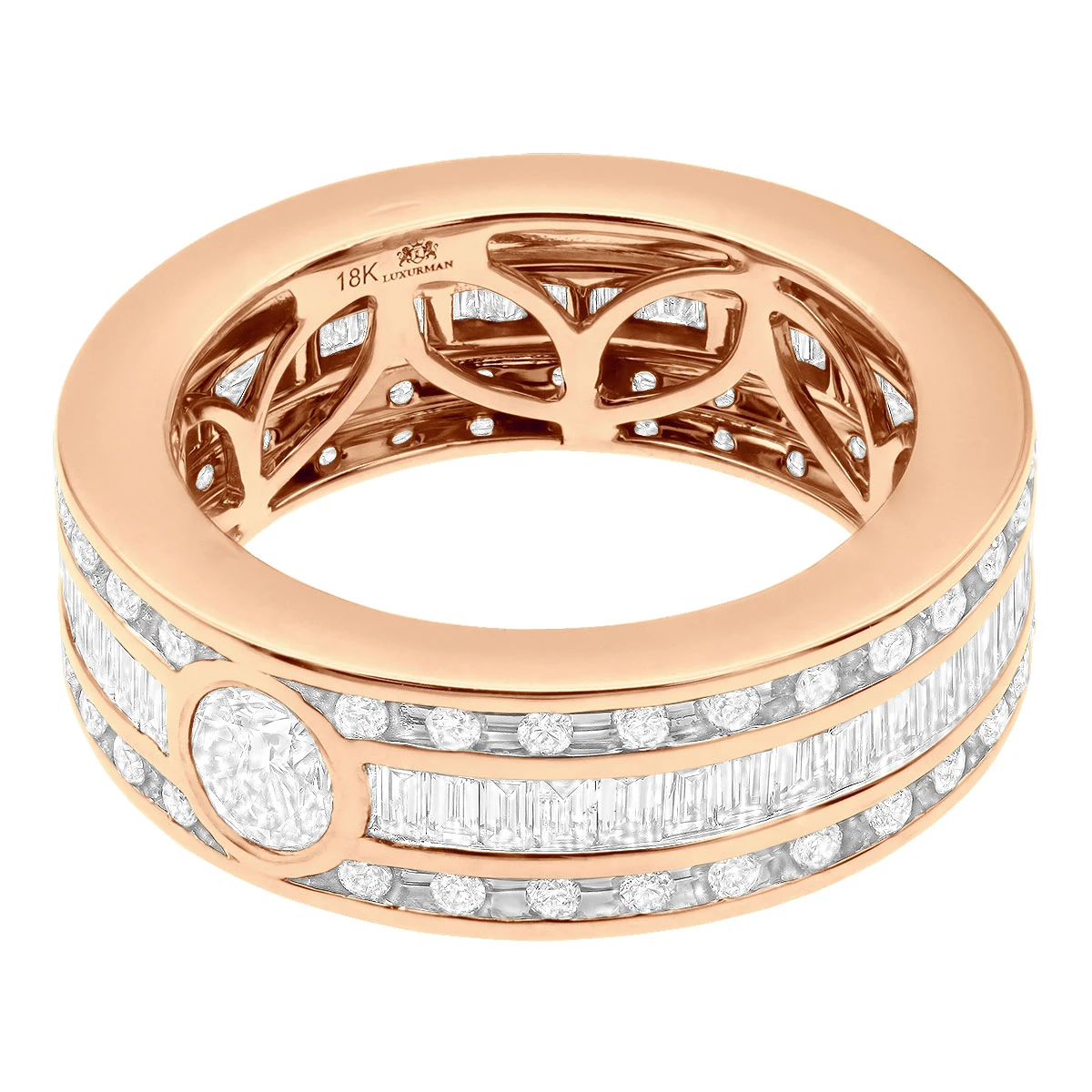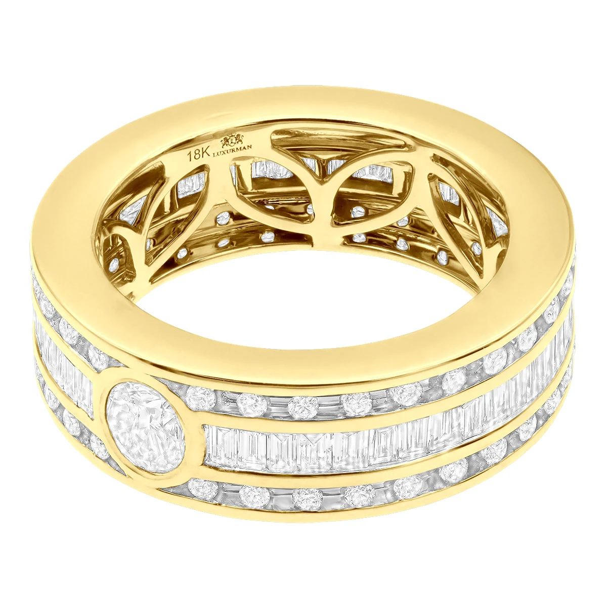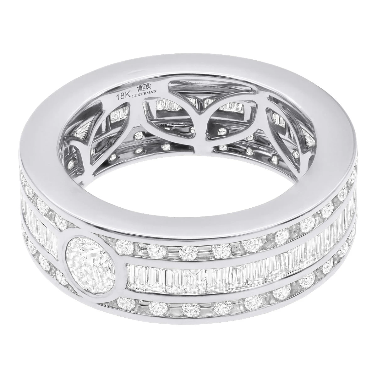 This exquisite Men’s Diamond Eternity Band 18k Gold Wedding Ring with Baguette & Round Diamonds is the perfect way to show your commitment and love. Crafted from 18k gold, this ring features a total carat weight of 4.5 carats of a unique combination of round and baguette diamonds. There is a half a carat round diamond set in the center of this ring. The ring is 8mm wide making it just the right size for a comfortable wear.This stunning eternity band is perfect for any special occasion, such as an engagement, wedding, or anniversary. It is also a great way to show your commitment and love for someone special. The ring is available in white, yellow or rose gold as well as platinum as a custom order, so you can choose the one that best suits your style.This eternity band is a timeless piece that will last for generations. It is also a great way to commemorate a special moment in your life.
