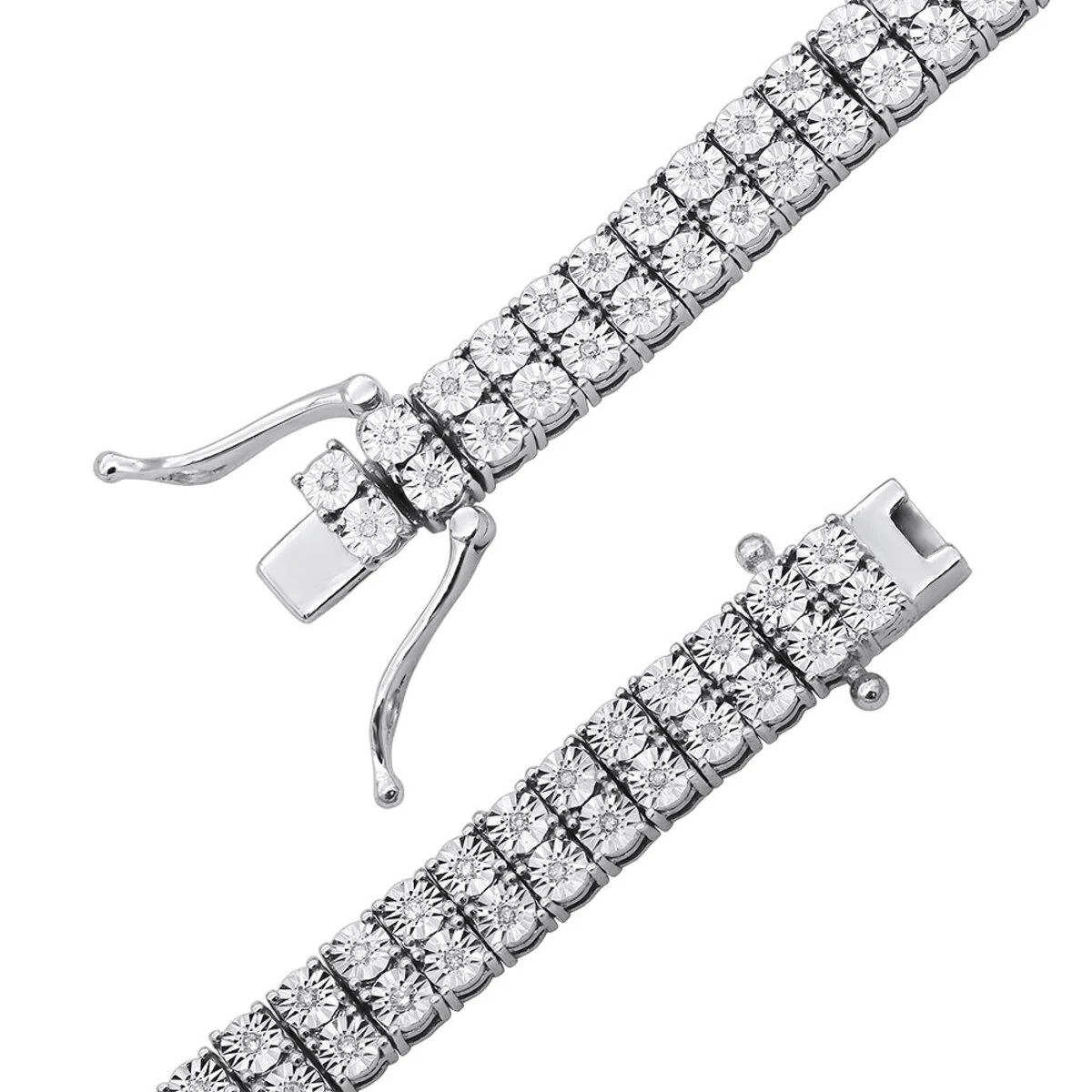 From our men’s diamond chains collection this affordable men’s diamond tennis necklace is made in real sterling silver and features 2 rows of genuine diamonds in illusion setting for incredible shine. This sterling silver diamond chain for men features a secure box lock with two safety pins and is 1/4 inch (6mm) wide. The listing is for necklace in 22 or 24 inches long but can also be made in other lengths as a custom order.