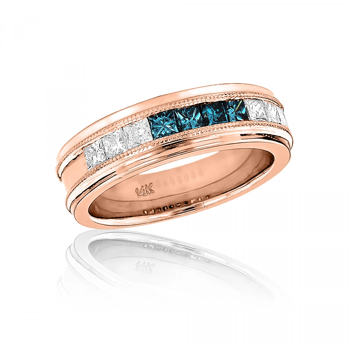 This custom made Men’s White Blue Diamond Wedding Band w Princess Cut Diamonds in 14k Gold from our men’s diamond jewelry collection showcases 1.1 carats of sparkling princess cut diamonds, each masterfully channel set in a lustrous gold frame. Featuring a simple yet luxurious design and a highly polished gold finish, this one of a kind men’s diamond wedding ring is available in your choice of 14K white, yellow and rose gold, and can be manufactured on per order basis with a combination of any fancy color diamonds (canary yellow, fancy blue, black, chocolate, pink, green, red, and cognac diamonds).
