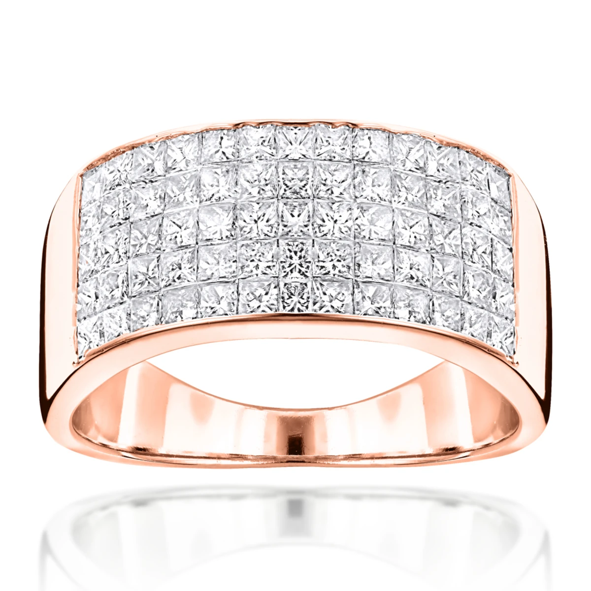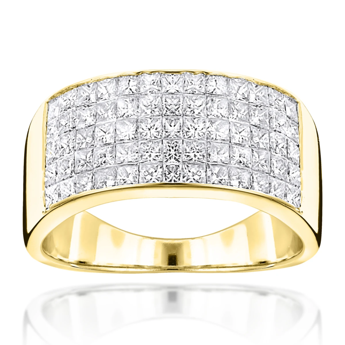 This Men’s Wide Wedding Band with Princess Cut Diamonds in 14K gold showcases 2.11 carats of invisibly-set diamonds and is available in 14K white, yellow and rose gold.