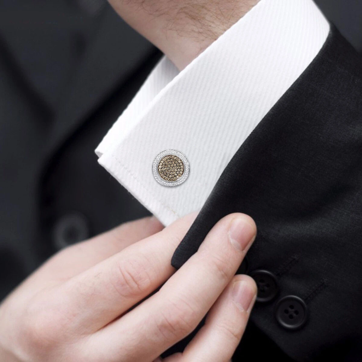 These Round Champagne and White Diamond Men’s Cufflinks in 14K gold showcase 1.9 carats of sparkling diamonds. Featuring a stylish combination of bright polished gold finish and a black rhodium plating, these gorgeous cufflinks are available in 14K white, yellow and rose gold.