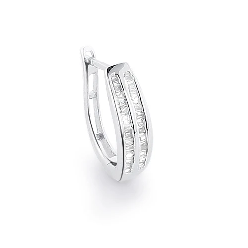 Our glistening 14K gold baguette diamond hoop earring can be worn by both men & women! This diamond hoop earring features 0.25 carats of sparkling channel set baguette diamonds and convenient omega closure for secure wear. Available in 10K or 14K yellow, white and rose gold. Please note this is a single hoop earring, to wear as a pair please purchase 2 earrings.