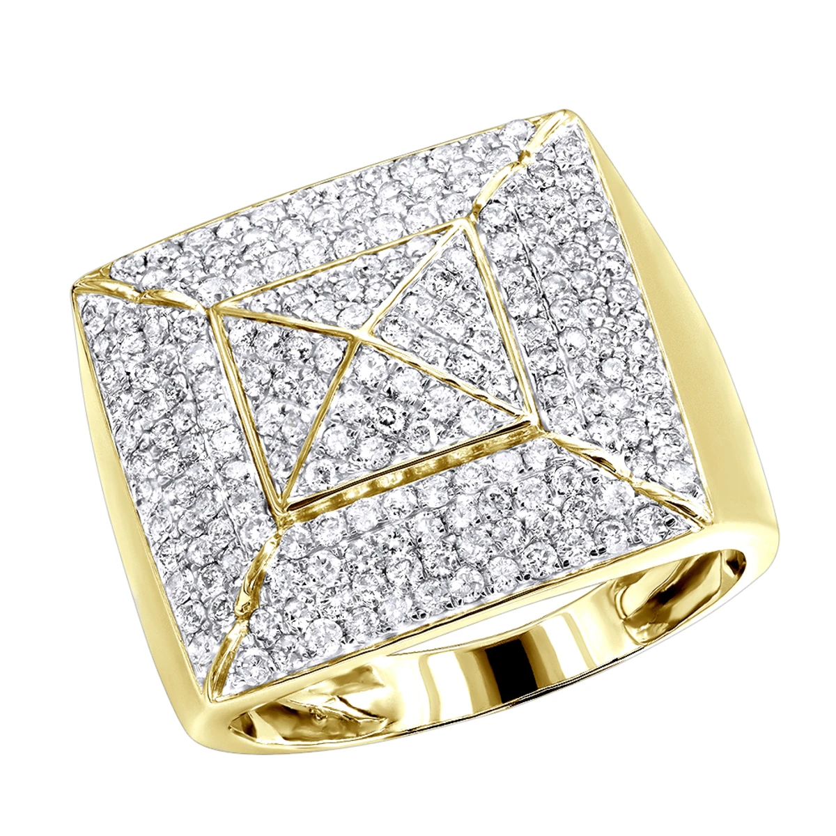 Luxurman Pinky Rings: This stunning pyramid shaped Solid 10K Diamond Ring for Men by Luxurman makes a perfect diamond pinky ring; this diamond ring weighs approximately 10 grams and showcases amazing 2 carats of masterfully pave set shiny round cut diamonds. Featuring a contemporary design and a highly polished gold finish, this men’s diamond ring is available in 10K white, yellow and rose gold.