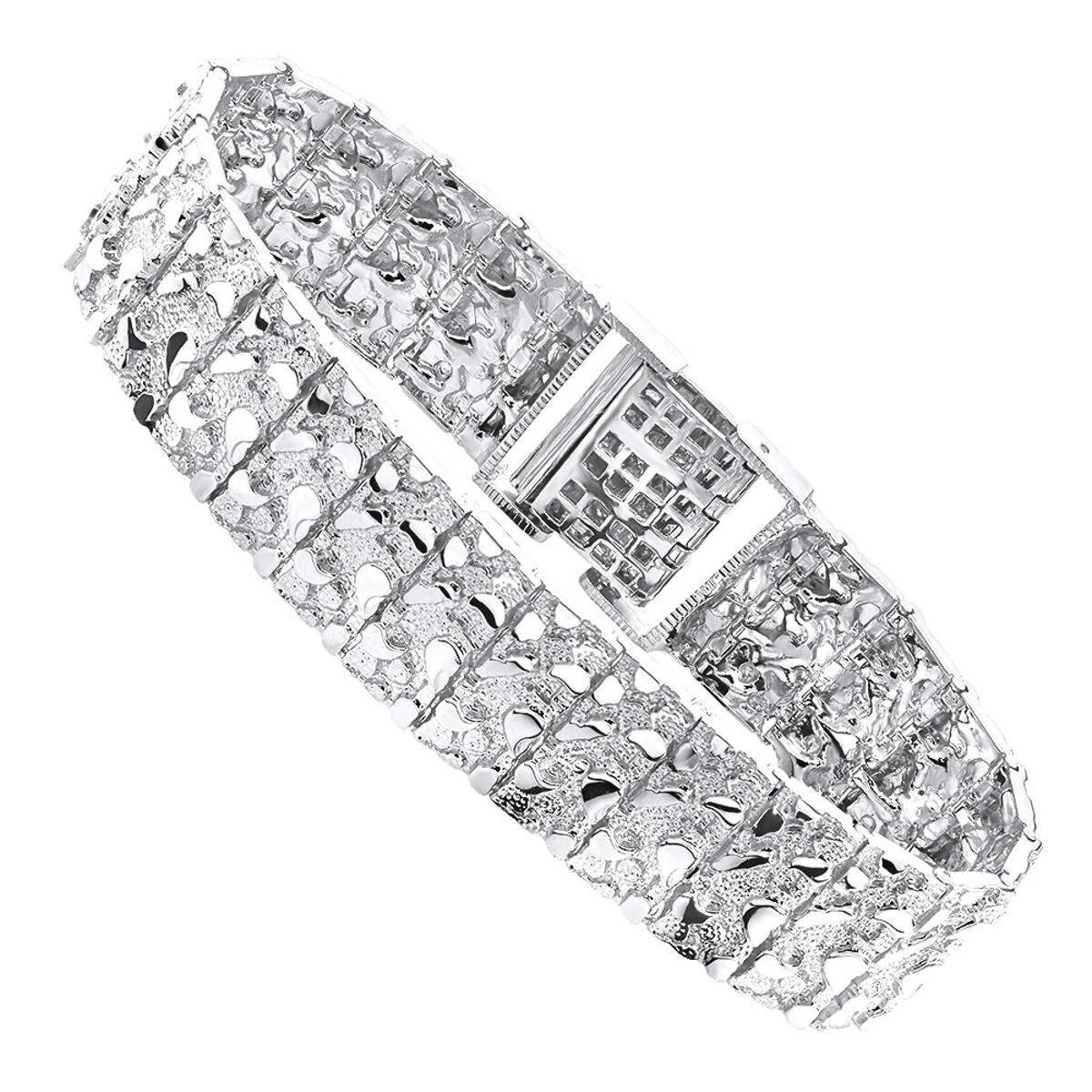 This is a stunning solid 10K gold Nugget Style Bracelet for Men, the bracelet is 3/4in. (20mm) wide, made from solid 10k gold and is available in variety of width and length options, as pictured bracelet is 3/4in wide and 8 3/4 inches long, weights approximately 46 grams. Featuring a luxurious design and a highly polished gold finish this gold nugget bracelet for men is sure to add uniqueness to your jewelry collection. Bracelet is made in USA and is available in any length in 1/4 inch increments. Contact us if you would like to customize this gold bracelet with diamonds or make it different width or length.