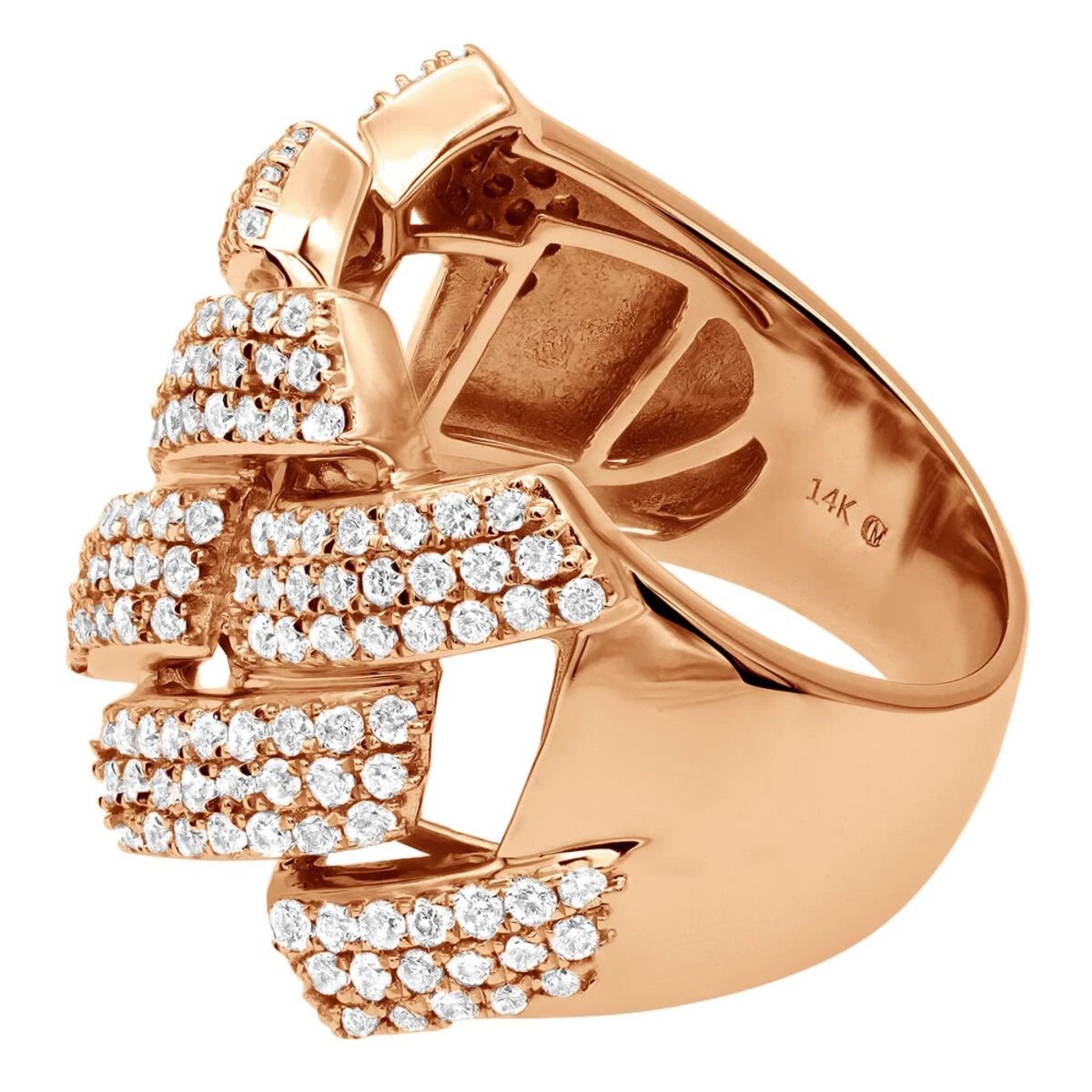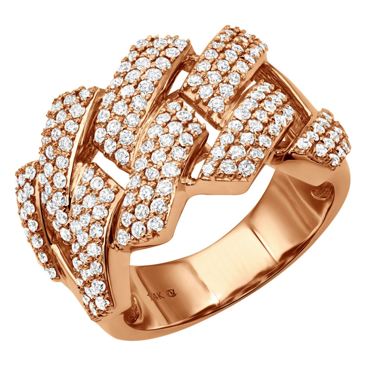 From our men’s diamond rings and men’s wedding bands collections: This Solid 14k Gold Cuban Link Ring is fully iced out with 2 carats of sparkling diamonds and is a contemporary statement of stylishness and features superb craftsmanship. The band is 11/16in (18mm) wide and weighs approximately 13.5 grams making it also a unique diamond wedding band for men. This sparkling ring with a design of sharp edged chain links encrusted with natural mined round diamonds has just enough bling for anyone! It is available in 14K white, yellow or rose gold and will be a show stopper in any color.