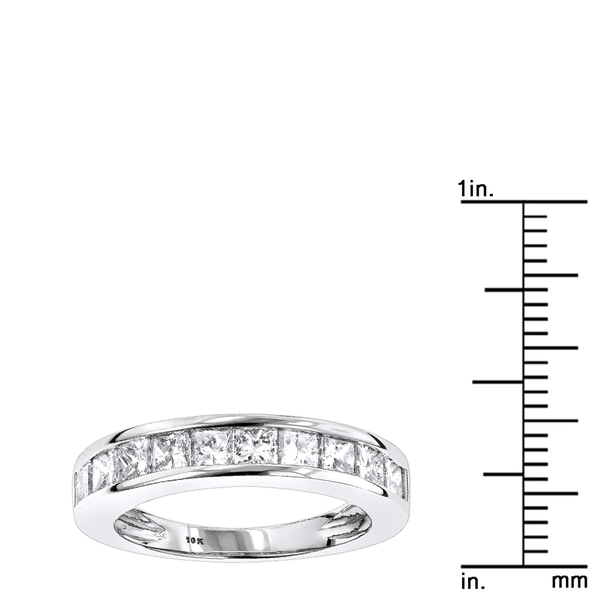 This 1 Row Princess Cut Diamond Wedding Band in 10K Gold weighs approximately 4 grams and showcases 1.65 carats of channel-set diamonds. Featuring a luxurious design and a highly polished gold finish, this diamond wedding ring is available in 10K white, yellow and rose gold.