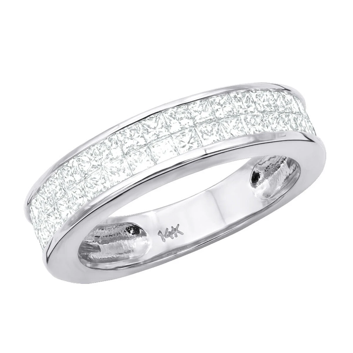 This Princess Cut Diamond Wedding Band in 14K gold showcases 1 carat of invisibly-set diamonds. Featuring a classic design and a highly polished gold finish, this diamond wedding ring is available in 14K white, yellow and rose gold.