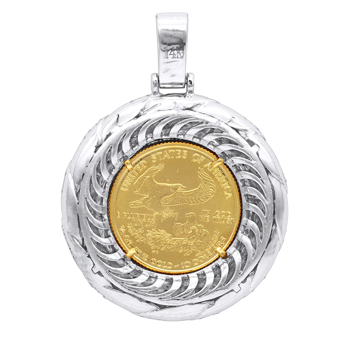 From our men’s diamond pendants collection This unique Gold Liberty Coin Diamond Pendant for Men in the shape of medallion showcases 3.1 carats of sparkling round diamonds intricately set on 14k gold swirls to frame the center of the medallion with a unique feature – a Double Eagle Liberty Coin! The backstory to this coin’s design is very intriguing. President Theodore Roosevelt was inspired by an exhibition of ancient Greek coins at the Smithsonian. He felt as though American coins lacked style and beauty compared to the Grecian coins and in 1907, he chose famous American sculptor Augustus Saint Gaudens for the job to improve American coin. Many consider Saint Gaudens Double Eagles Liberty Coin the most beautiful coin in history. This stunning diamond pendant is available in 14K white, yellow and rose gold frame, it’s braided diamond frame will look amazing in any gold color both from back and front in pair with the yellow golden medallion in the middle. This pendant is 2 inches (50mm) long (with the beautiful diamond encrusted bail) and 1 1/2 inches (37mm) wide. Please note: year of the coin might vary depending on availability and the chain is for illustration purposes only, if you need chain it has to be purchased separately. You also can personalize this piece or check we’ve already made and create your own design.