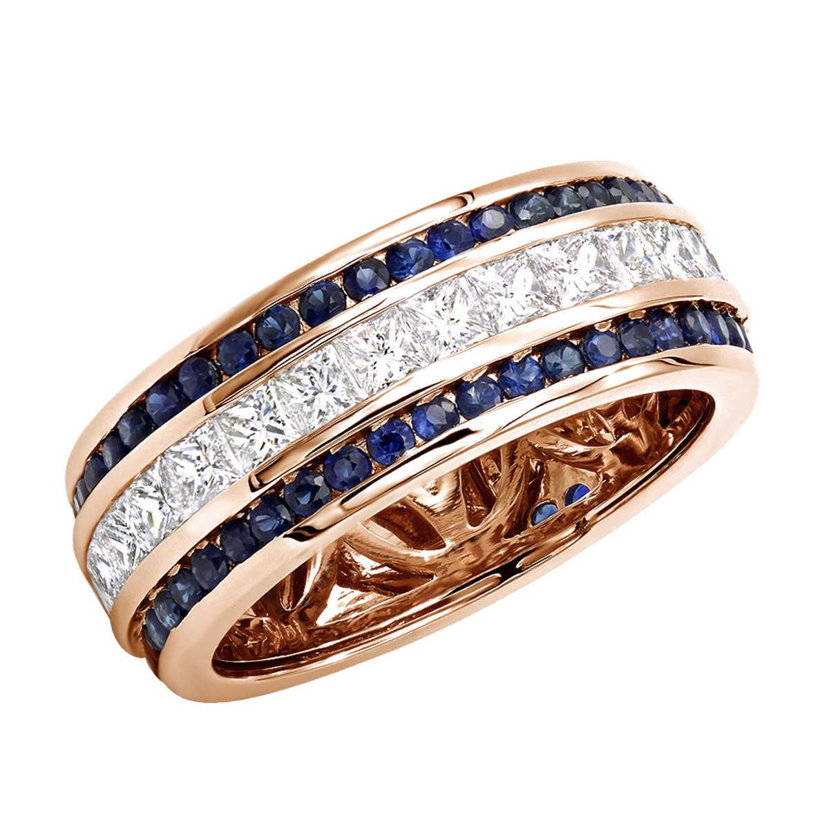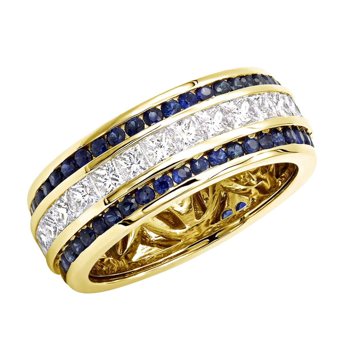 A unique wedding band style by Luxurman from our bridal collection featuring beautiful round blue sapphires and sparkling princess cut white diamonds. Sapphires are believed to symbolize wisdom, virtue and good fortune. In a wedding ring, a sapphire also means faithfulness and sincerity. This wonderful sapphire and diamond wedding band in 14K gold features a total of 4.5 carats of the precious stones. The contrasting precious stones are highlighting the beauty of each other perfectly making this ring unique and ideal to play a role of matching wedding bands for spouses. Available in 14k yellow gold, rose and white gold.
