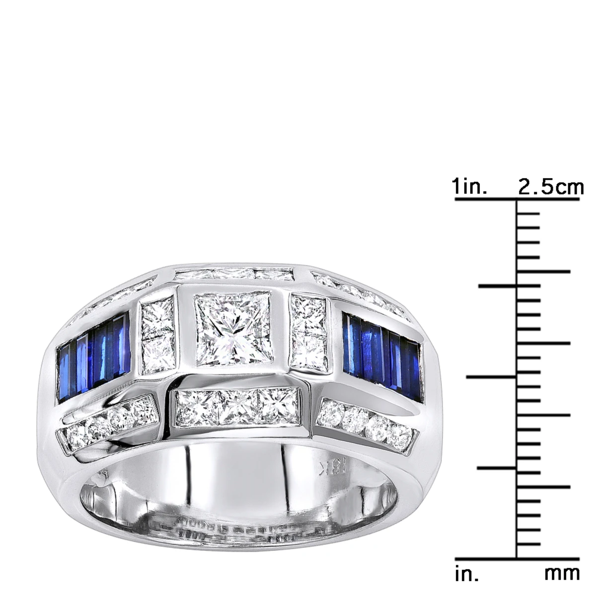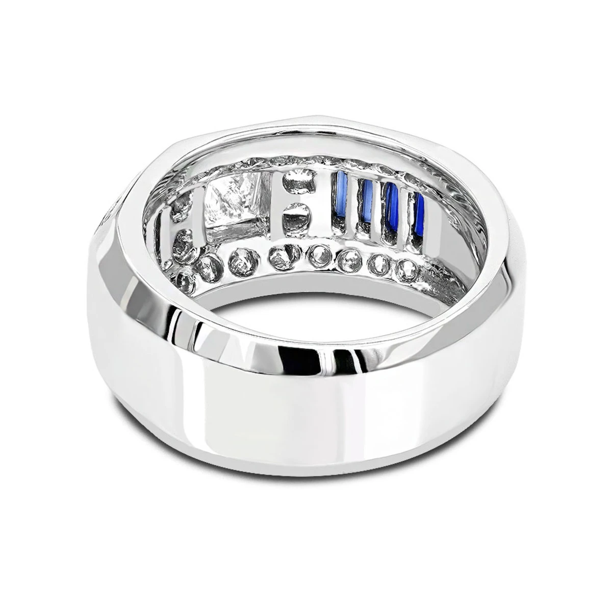 Luxurman Diamond Bands Collection: This Unique 18K Gold Sapphire Diamond Ring for Men by Luxurman a masculine and stylish design of princess cut and round cut sparkling diamonds and beautiful baguette cut sapphires totalling 3.5 carats framed in shiny luxurious 18k gold. This unique men’s diamond ring is available in 18k yellow gold, rose gold, white gold as well as Platinum (as a custom order) various sizes, and can be customized with any color and quality diamonds and gemstones, also makes a very unique diamond band for men. Please contact us at 212-398-3123 if your size or desired option is not listed or if you would like us to customize it for you.