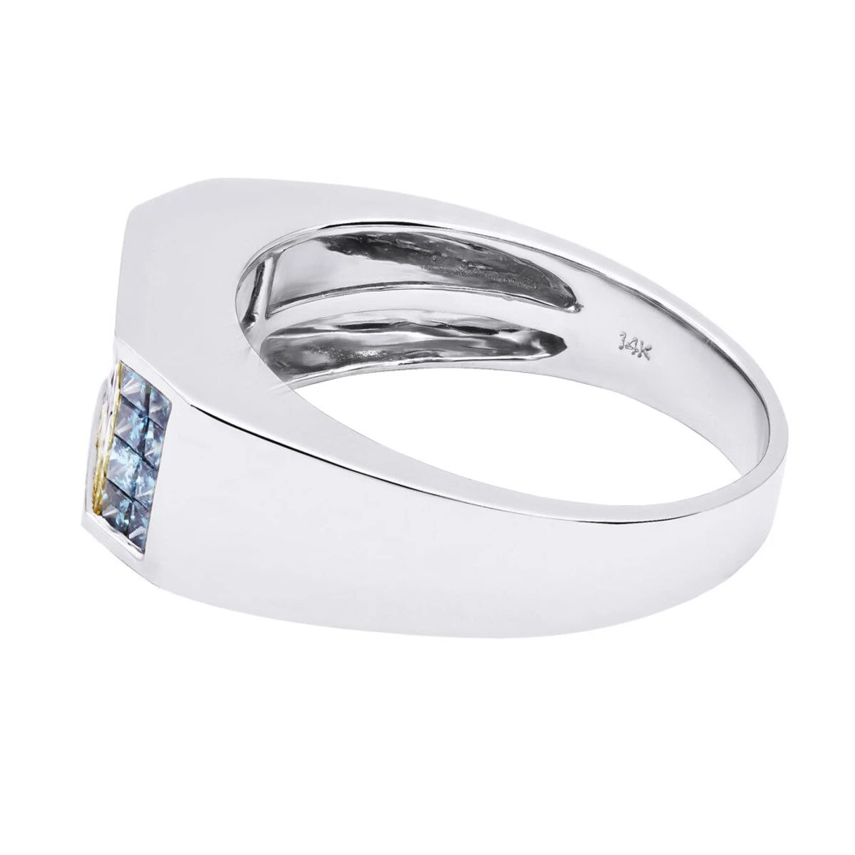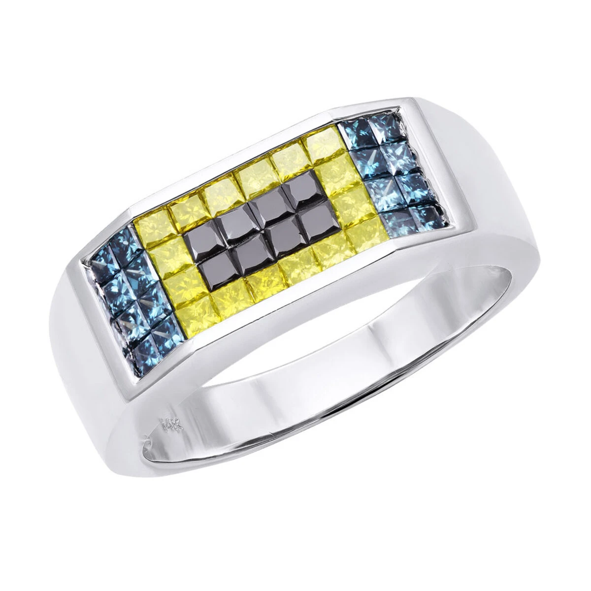 This very unique men’s wedding band is made in 14K White Gold and features 1.88 carats of invisible set fancy color diamonds: 8 invisible set black princess cut diamonds in the middle with 16 yellow princess cut diamonds around them and finally 8 invisible set blue princess cut diamonds are set on the sides for a total of 1.88 carats. Featuring a very unique combination of diamonds and a highly polished gold finish this ring will make a unique diamond wedding band for men.